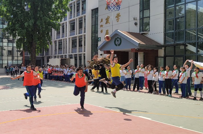 4月20日中午,一场激动人心的“一二大战”开始了。在赛前,比赛队员纷纷做好了准备,他们早早来到楼下练习投篮,不一会大课间的铃声响起,球场上立刻挤满了观众。