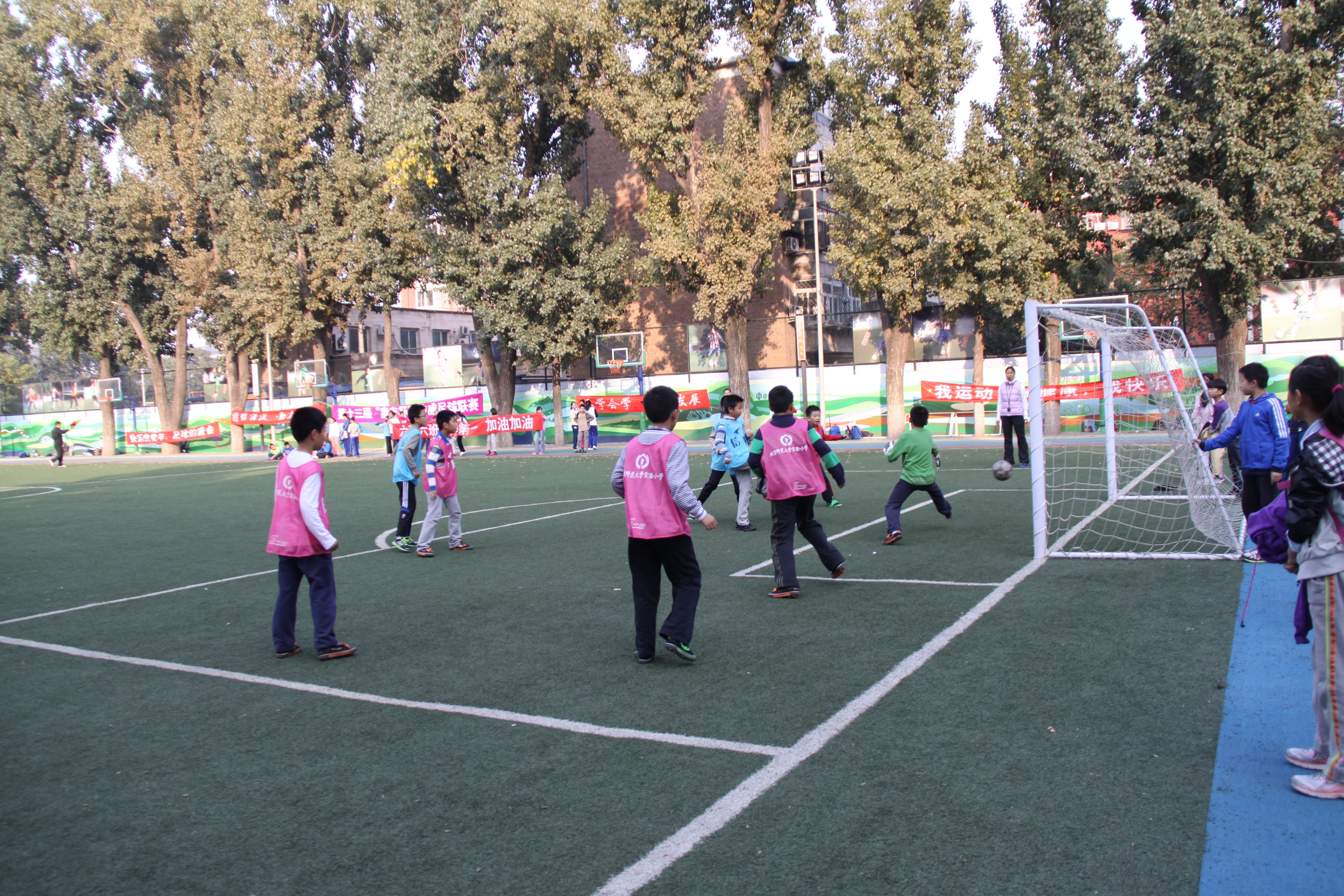 2013年10月9日下午3点,在北师大实验小学的大操场上,一场精彩的足球赛即将开始。比赛双方是卫冕冠军五(2)班的“天马传奇队”和五(5)班的“小将队”。比赛前,双方队员早早到达大操场,进行热身。啦啦队队员也带上花球和加油牌,准备好为自己班的球队呐喊助威。