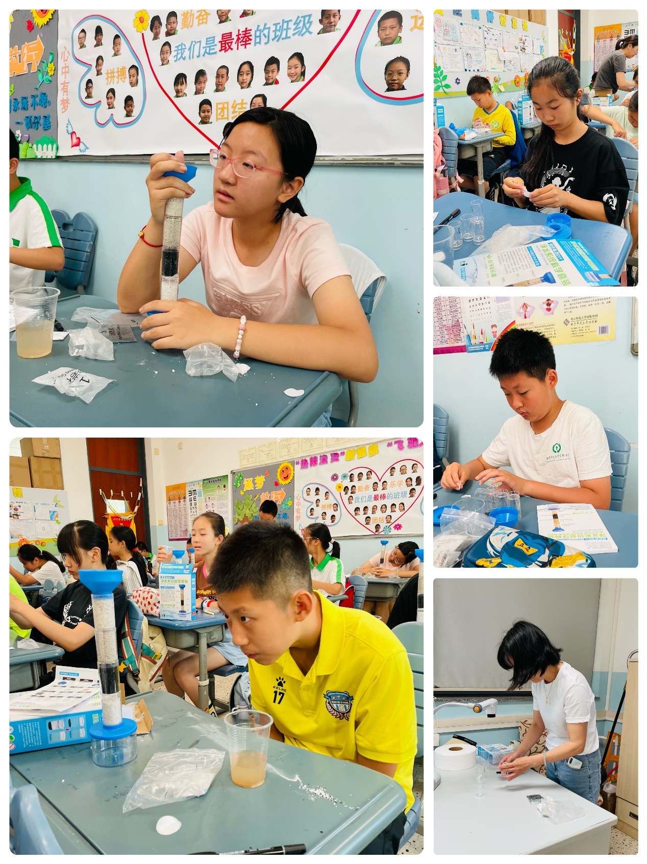 实验过程中,同学们认真听、看、学、做,知道了污水如何净化,粉笔如何分离墨水中的不同颜色,进而知道了城市污水净化工艺和污染物分析监测技术。原来科学的奥秘就隐藏在这些简单有趣的小实验中,原来生活学习中处处有科学,只要你有双善于发现奥秘的眼睛和勤劳的双手。