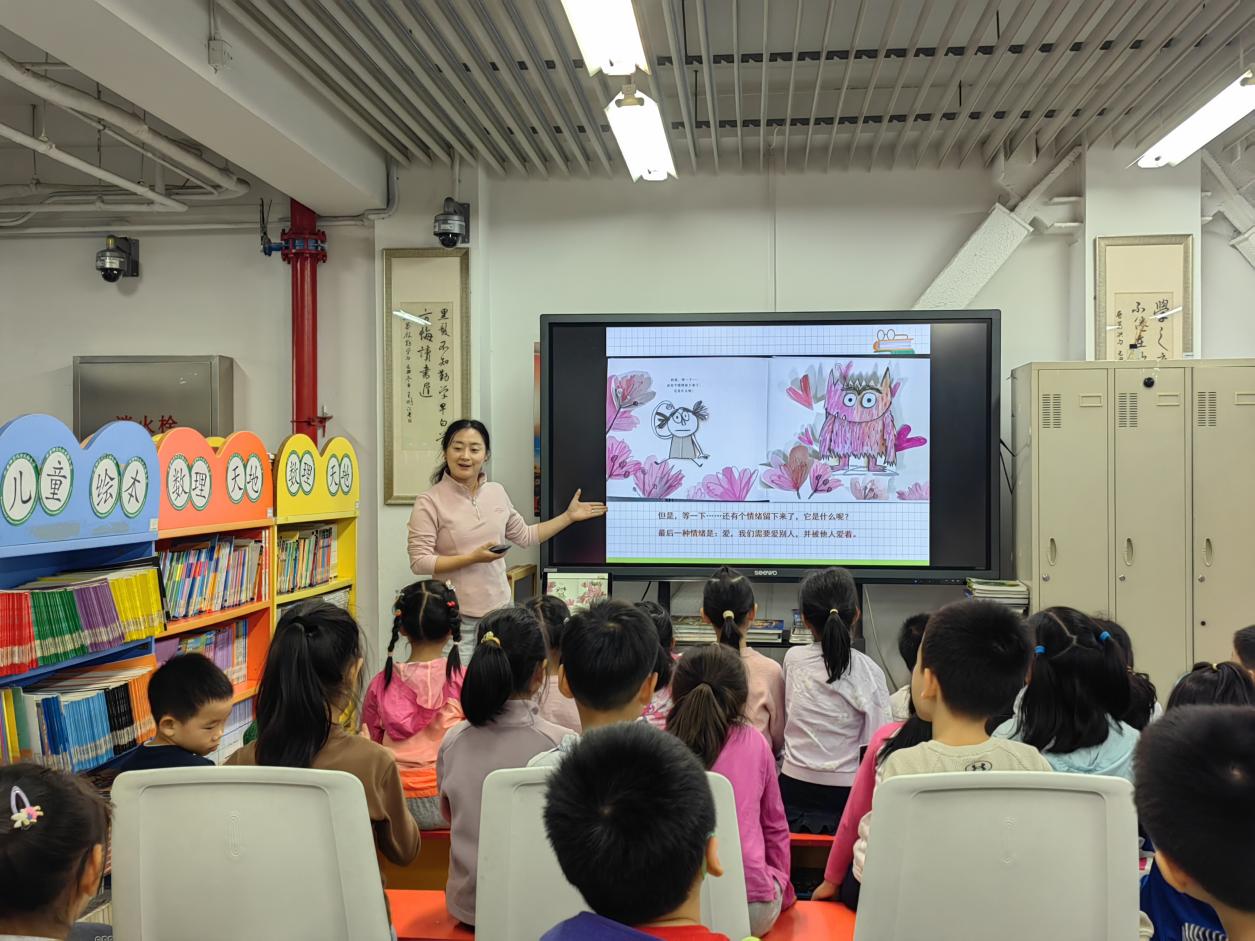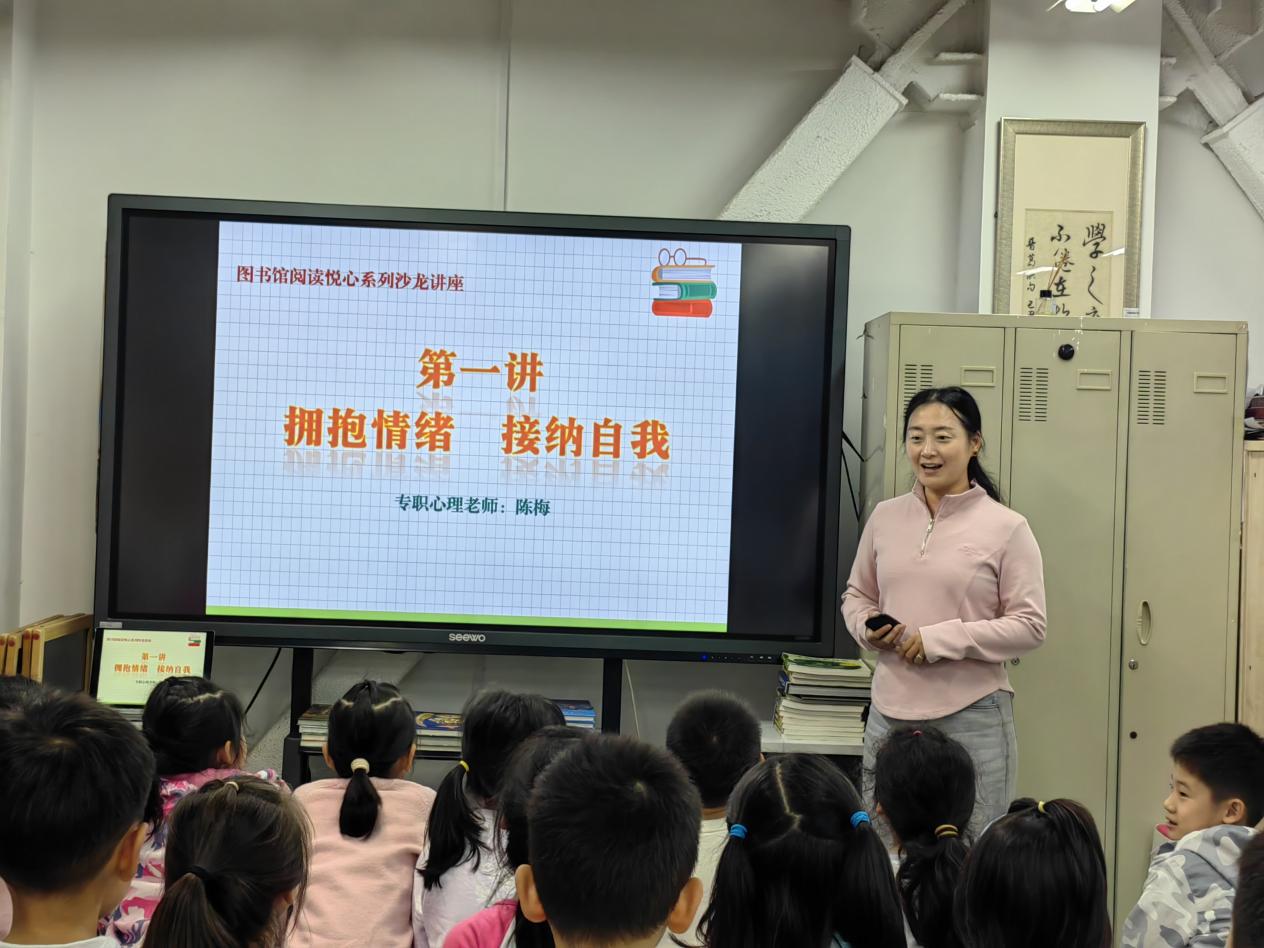 在10月14日午间的图书馆里,陈梅老师给小同学们上了一节生动形象的心理健康活动课:《拥抱情绪,接纳自我》。作为六年级的心理观察员,图书馆周老师邀请我参与了这个课堂。