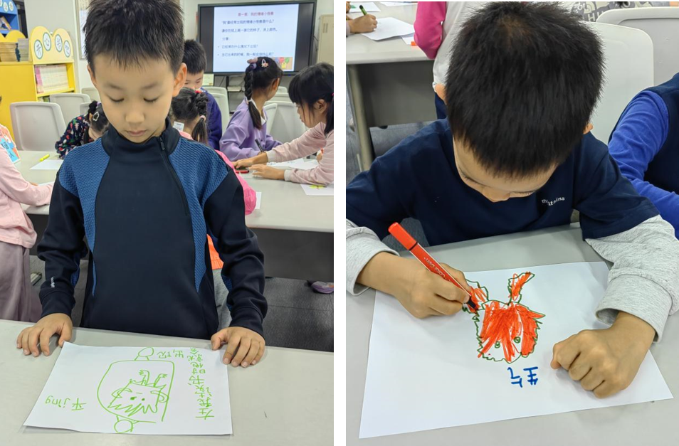 为了让小朋友们对自己的情绪有更好地察觉,陈老师让每位同学拿起彩笔,画一画自己的“情绪小怪兽”。她引导孩子们思考:“我”最经常出现的消极情绪是什么?会在什么情况下出现?我的感受是什么?“我”通常如何应对这种情绪?