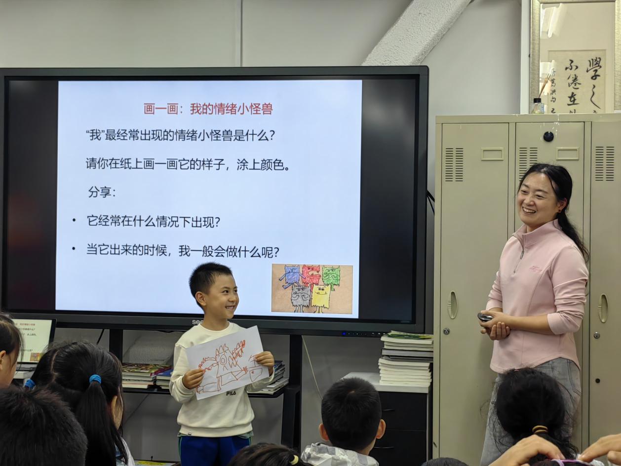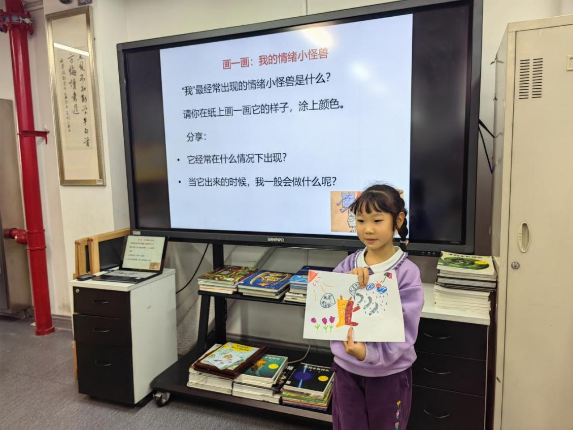 陈老师首先带大家浏览了《我的情绪小怪兽》这本书,并讲述了书中的各种情绪“小怪兽”。例如开心小怪兽就像太阳发光、像星星闪烁;伤心小怪兽就像下雨天;愤怒小怪兽就像红色的火焰……这些形象的比喻让同学们一下子就懂了情绪的模样。