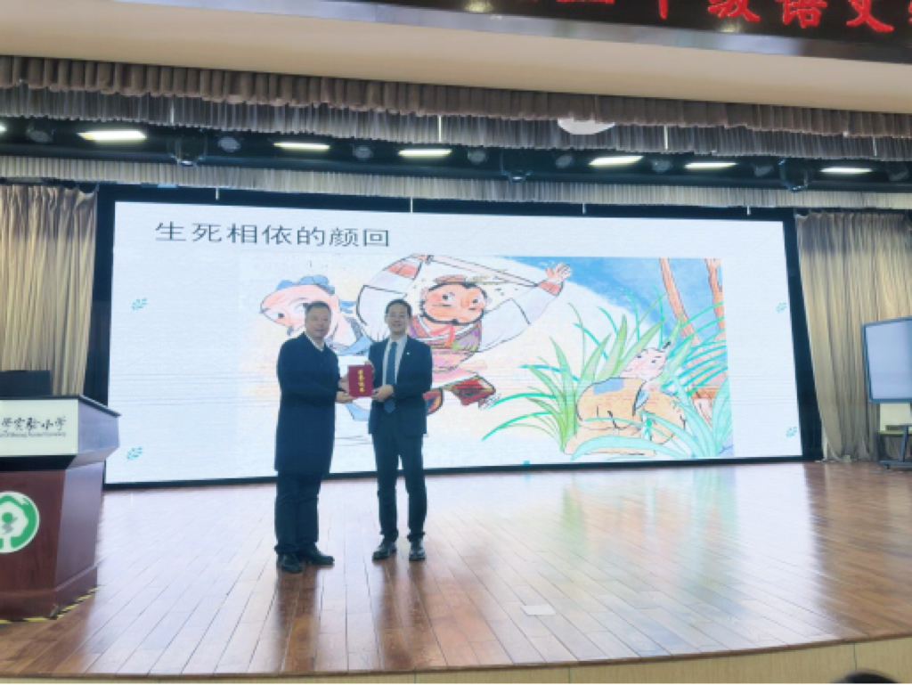 活动的最后图书馆周老师向大家推荐了我校图书馆新进图书——孟琢教授所著的《汉字就是这么来的》、《国学典籍那么好看》等系列丛书,并欢迎同学们在大课间来图书馆借阅。董校长参与了本次活动,并在讲座结束后为孟教授颁发了荣誉证书。