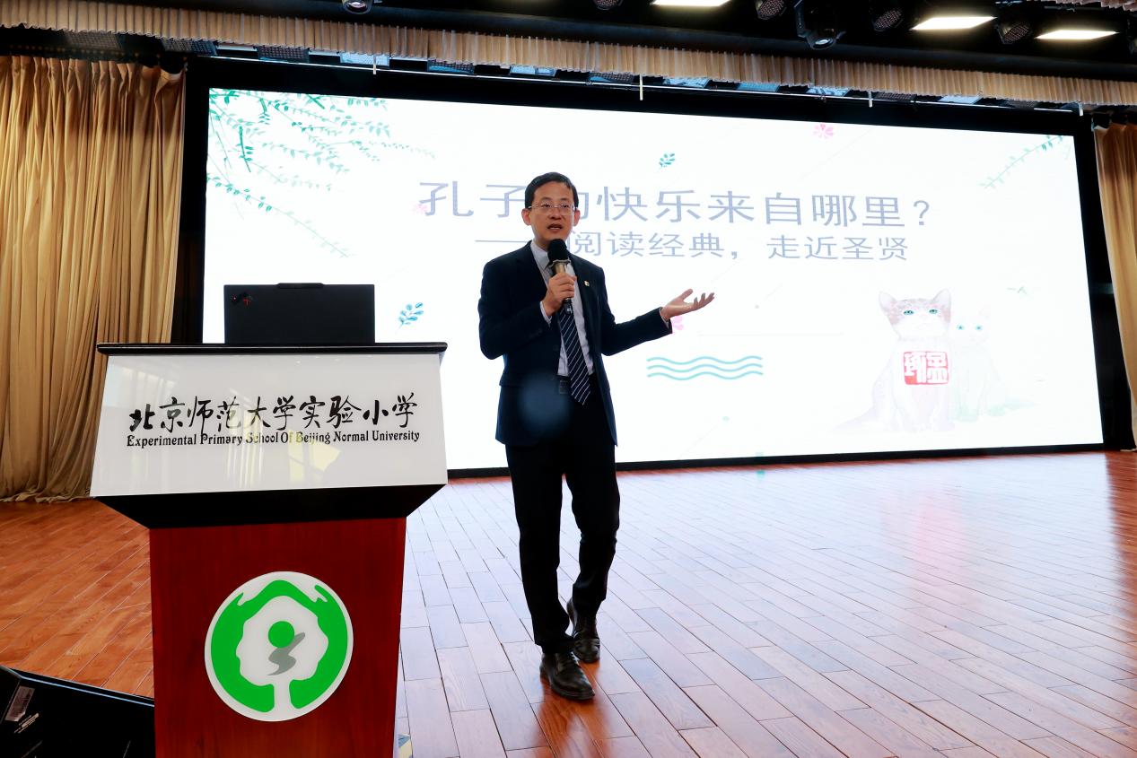 2025年11月10日上午,北京师范大学实验小学五层报告厅内书香氤氲,“趣读经典——图书馆联合三年级语文学科阅读分享活动”在此拉开帷幕。北京师范大学文学院孟琢教授以《孔子的快乐来自哪里?——阅读经典,走近圣贤》为题,带领同学们从《论语》中探寻圣贤的“快乐密码”,感受传统文化的温度与力量。