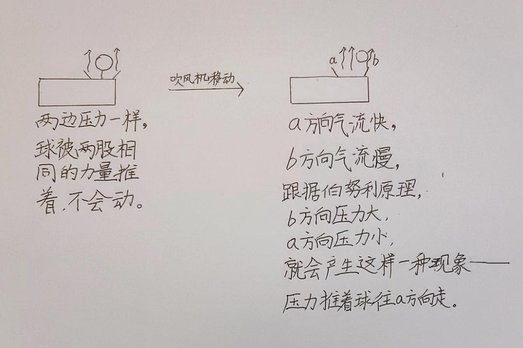 学习了伯努利原理,我终于知道球为什么会跟着吹风机走了!我画图说明: