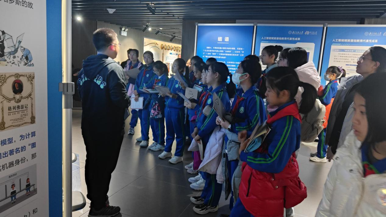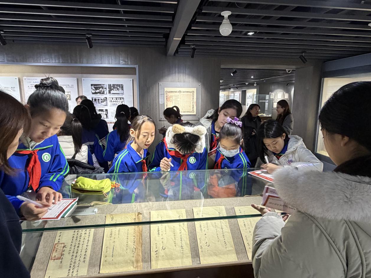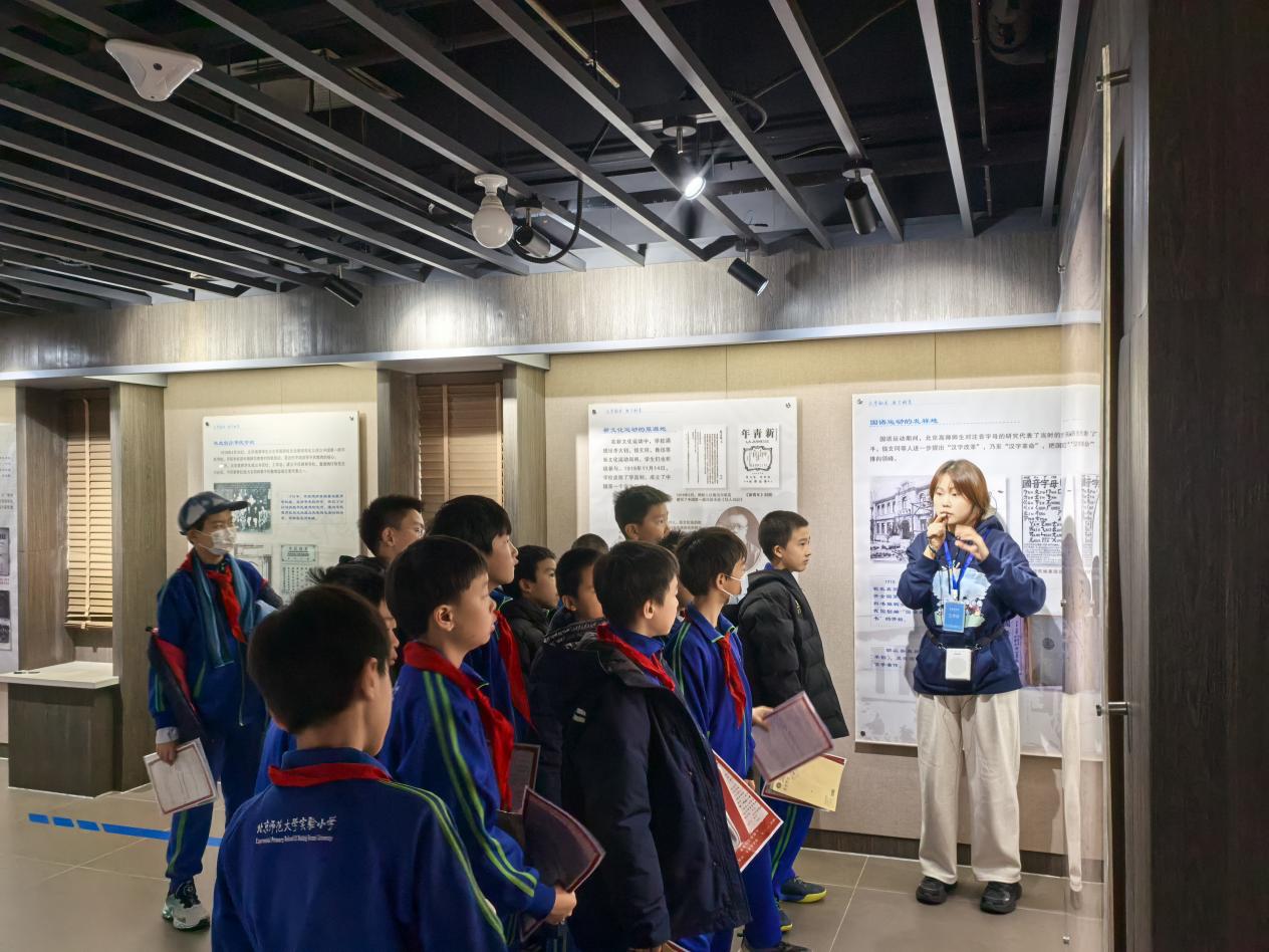 随后,在家长的带领下,学生走进校史馆与人工智能展厅,开启了一段跨越时空的探访之旅。在校史馆中,一件件珍贵的实物、一张张泛黄的照片,将学校与时代同频共振的历史画卷缓缓展开。学生围绕学习单中的探究任务,仔细观察、用心记录,从具体展品中追寻先辈足迹,理解个人成长与民族命运之间的紧密联系。通过设想与历史人物的“时空对话”,学生将敬仰之情化为真挚而朴素的表达,爱国之志在心中悄然生根。