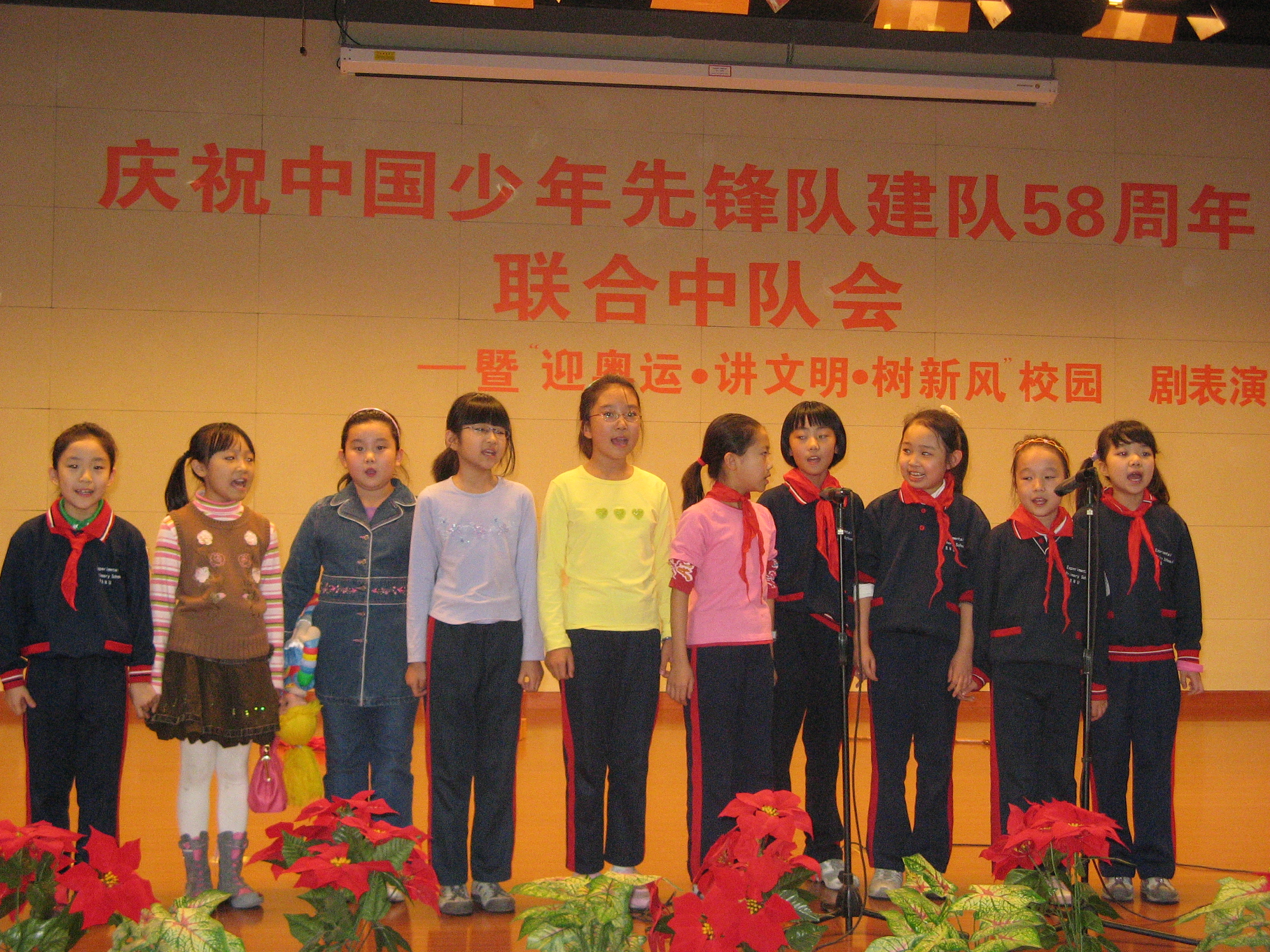 为了庆祝祖国母亲58岁生日及少先队第58个建队日,全体四年级学生于10月13日在A楼五层报告厅用一种别开生面的方式,举行了“庆队日、迎奥运、讲文明、树新风”联合中队会。在本次活动中,各个中队文明小剧的表演不仅使同学们知道了什么是“绿色奥运”,怎样做一名讲文明的好市民,而且还使同学们从中了解到文明就在举手投足之间,就在我们身边! 最后,由全体学生齐唱的一曲《爱我中华》,将此次主题活动推向高潮。