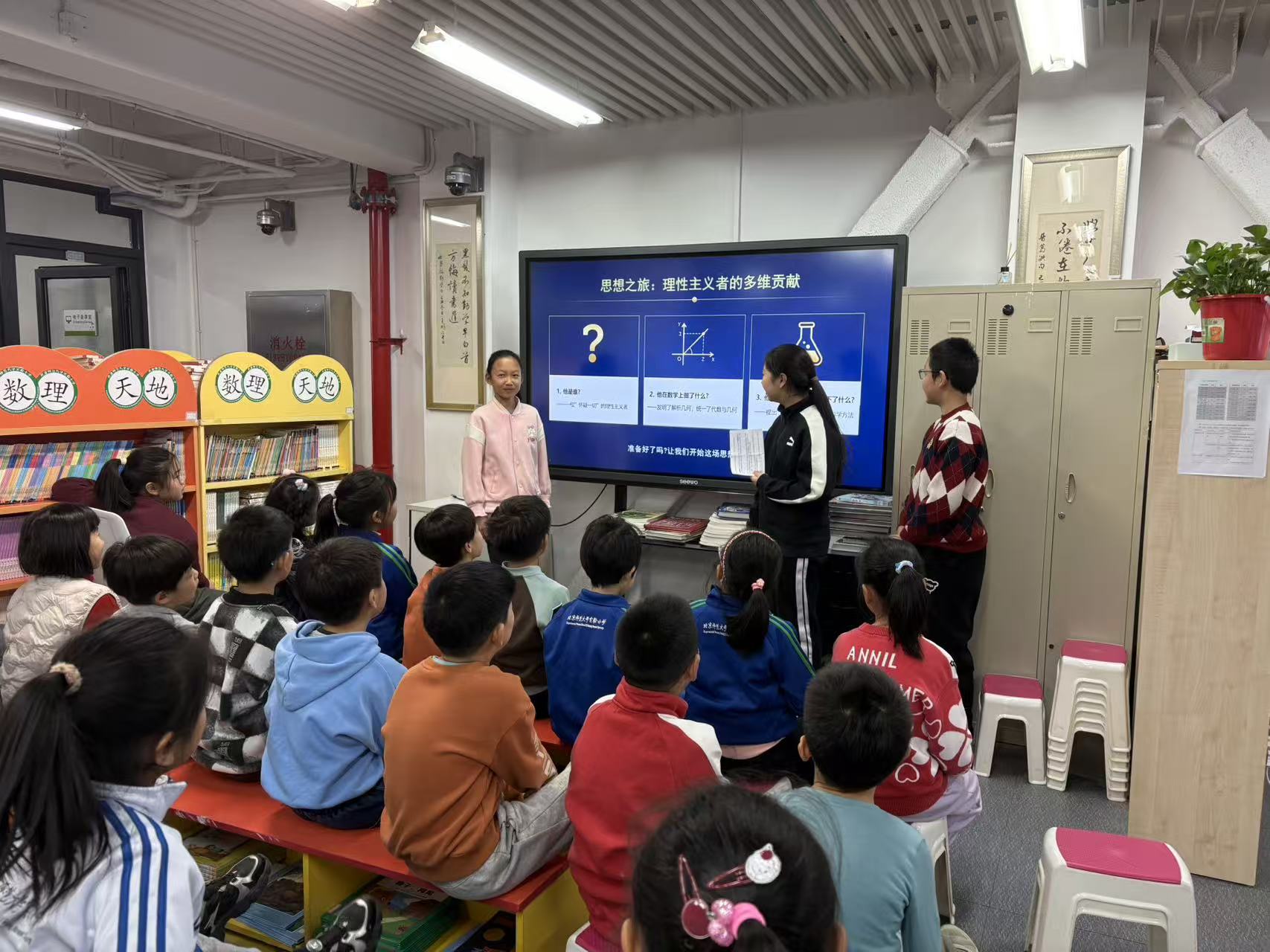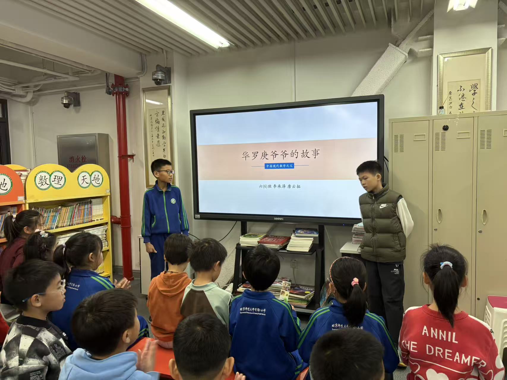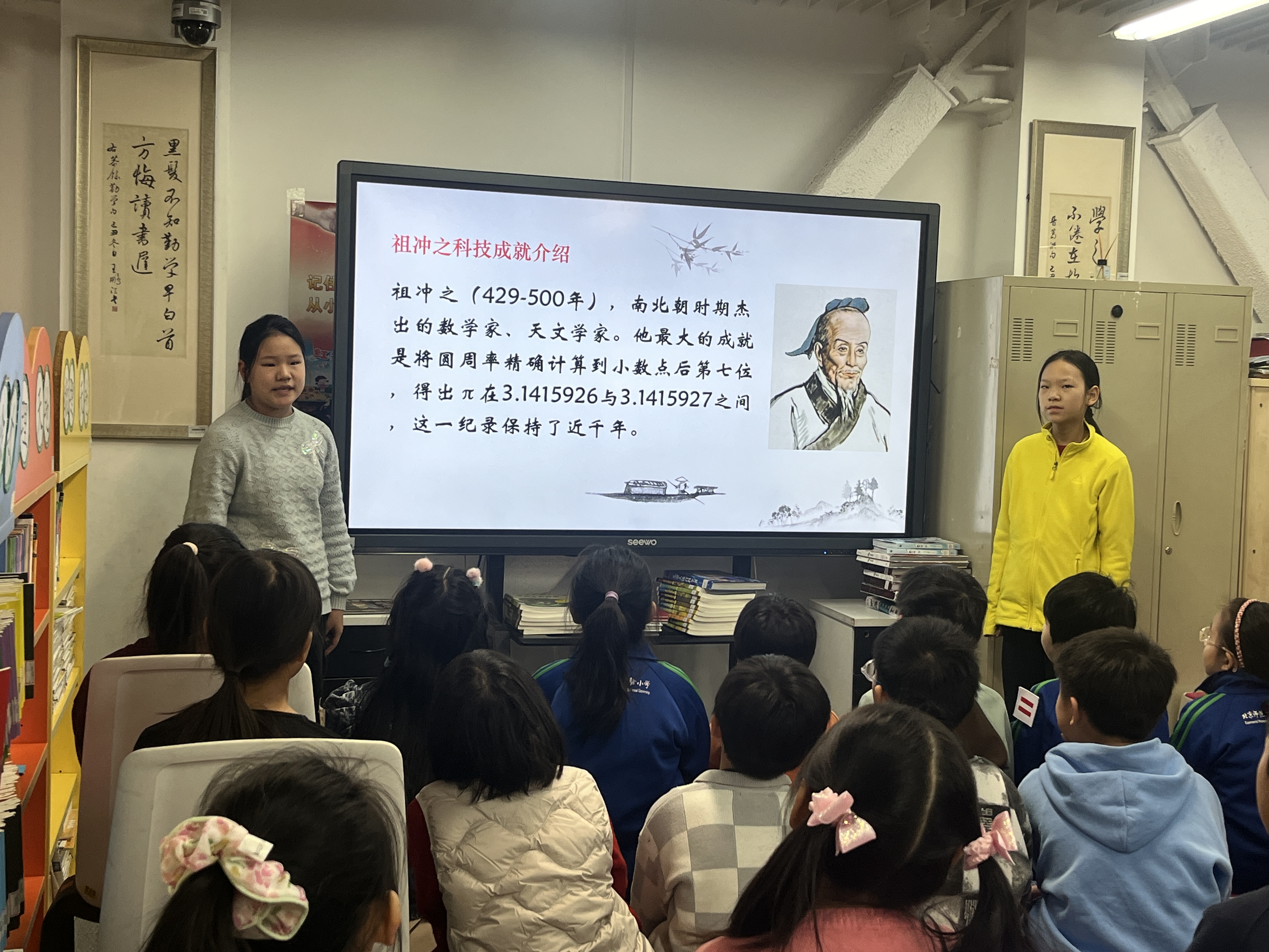 六(1)班秘睿阳同学带来《刘徽与圆周率的故事》,让小听众们直观认识“π”的来历;六(2)班学子聚焦祖冲之,深入讲述其对圆周率的推算成果,展现数学瑰宝的传承脉络;六(3)班、六(4)班的学长学姐接力分享《数学王子高斯》《科学超人阿基米德》的故事,动画短片搭配趣味互动,让图书馆充满欢声笑语;六(5)班三位同学携手讲述笛卡尔的传奇,石天乐学长借助PPT动画设计导航小游戏,将活动推向高潮;最后,六(6)班唐云拓、李承泽同学娓娓道来华罗庚先生的生平与治学精神,在三年级同学清脆的集体朗读声中,活动圆满落幕。