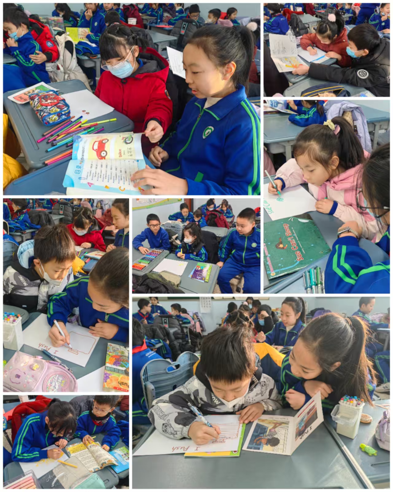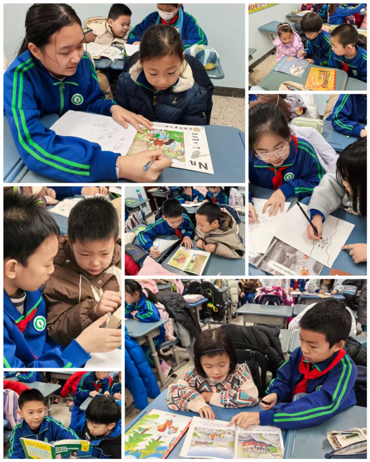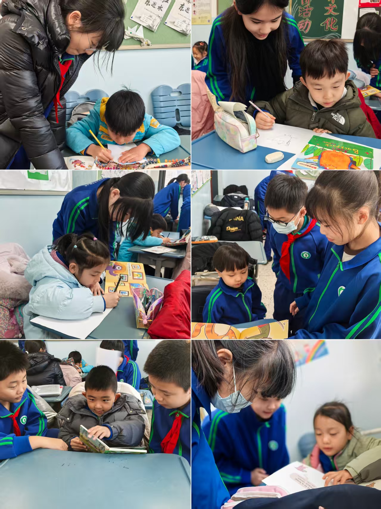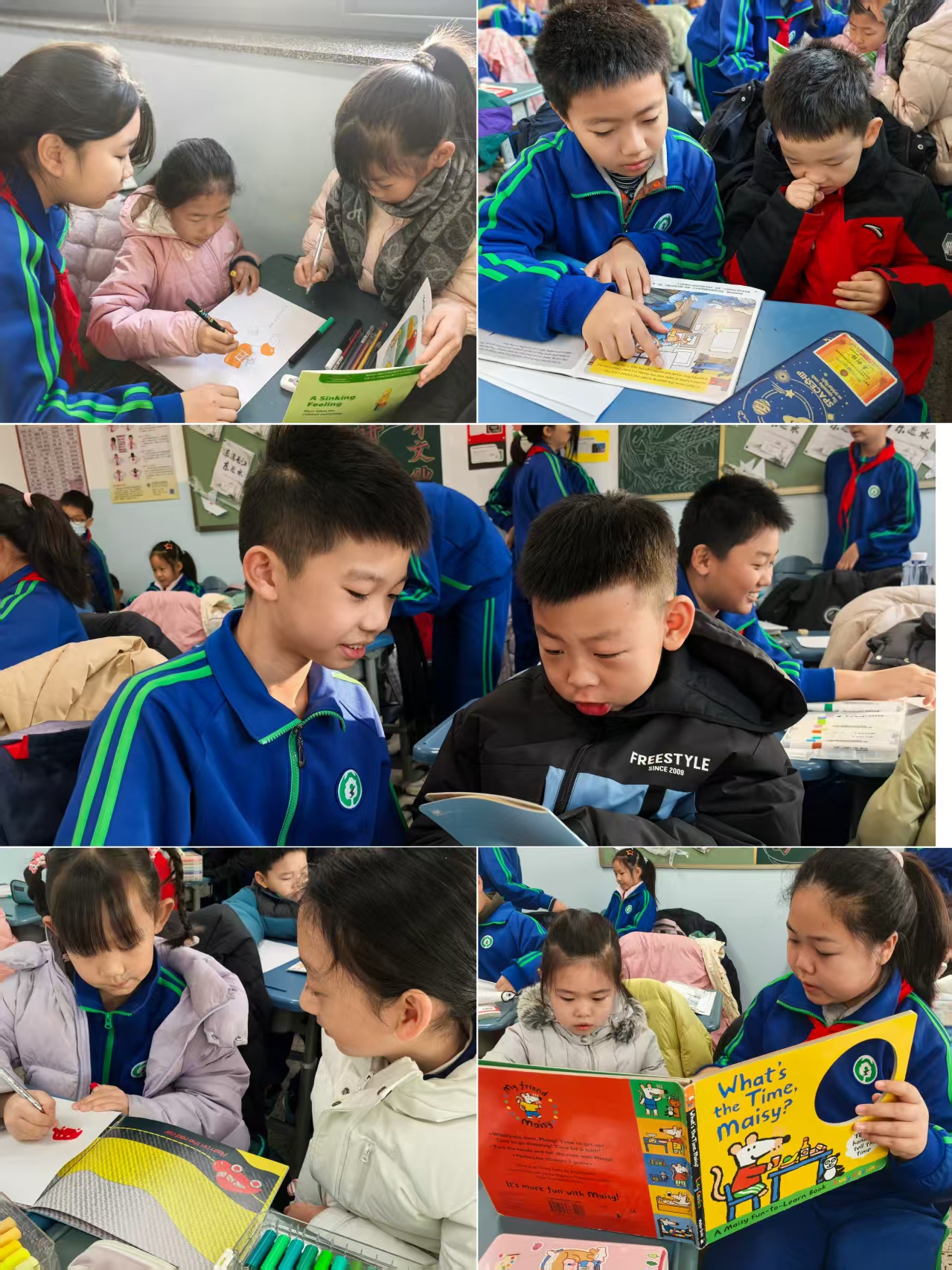 12月15日,六年级各班同学满怀热忱地走进一年级对应班级,以“一对一”结对的方式,开启了“共读英文绘本,点亮童年趣味”主题活动。六年级的学长学姐们化身专属“小小英文导师”,带着精心准备的绘本与弟弟妹妹们共度欢乐时光。有的同学选择画面鲜亮、句式简单的经典绘本,用夸张的表情和灵动的手势辅助讲解,帮助小朋友直观理解单词含义;有的同学设计“画一画”互动,引导结对伙伴画出绘本关键角色,用画笔加深记忆;还有的同学通过“演一演”“编一编”环节,与小朋友分组演绎故事片段、创编全新结尾,让一年级学子在大胆表达中感受英文学习的乐趣。
