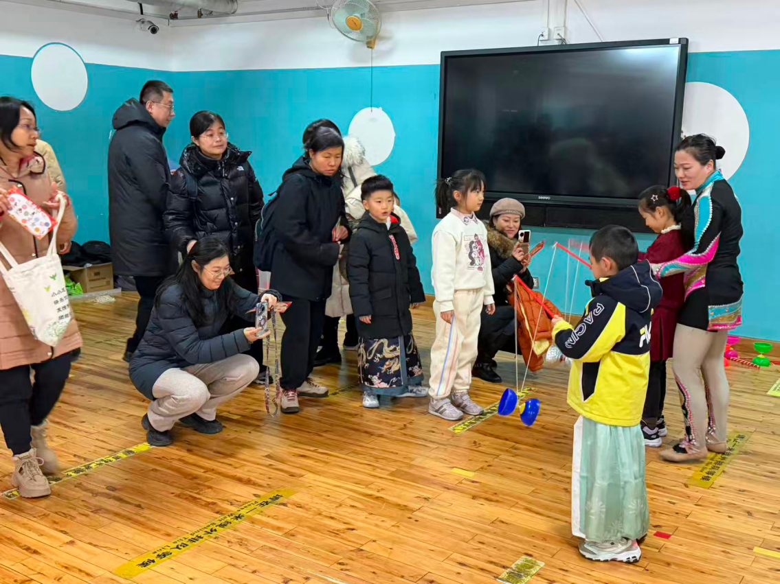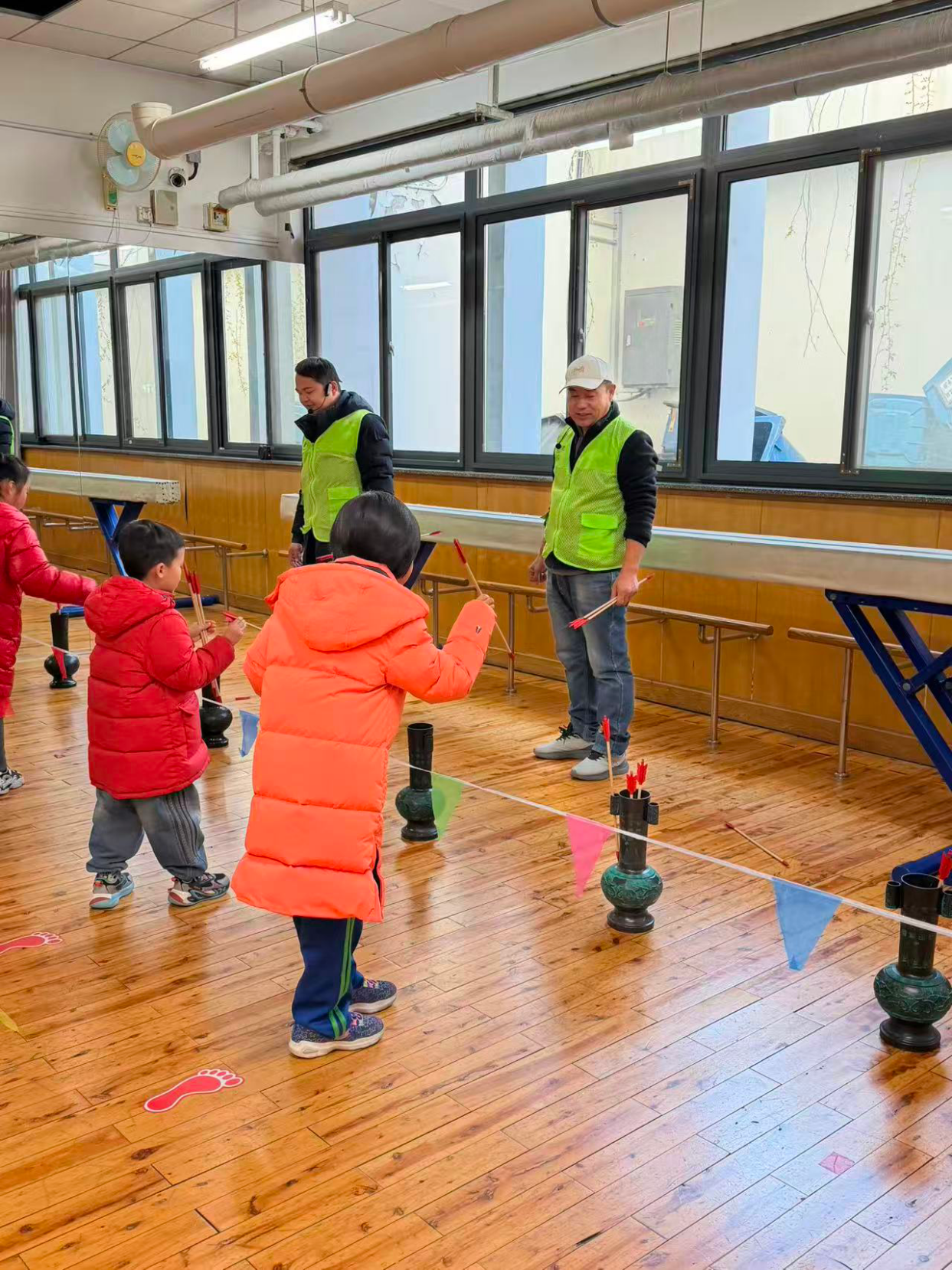 开幕展演后,学生手持游园手卡,分组走进操场与公共空间的非遗体验区,开启沉浸式体验。投壶体验让孩子们在一次次尝试中理解专注、礼仪与规则;抖空竹带来节奏与技巧的挑战;滚铁环、套圈等民俗游戏在欢笑声中锻炼了身体协调性与合作意识。