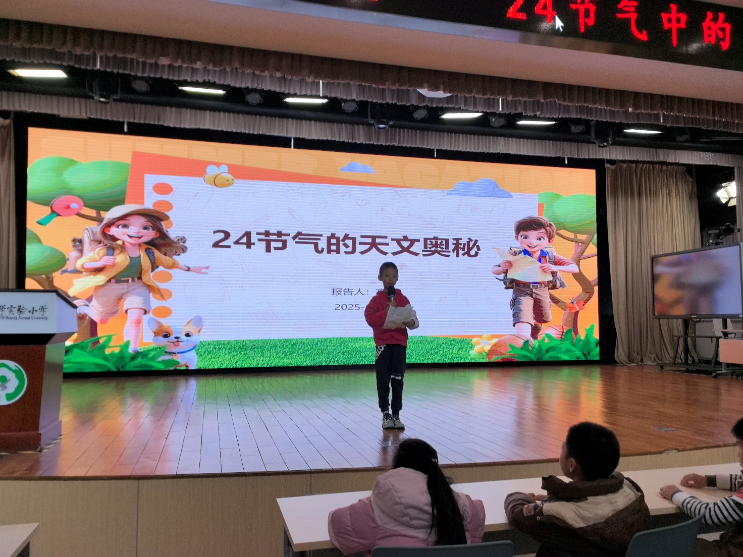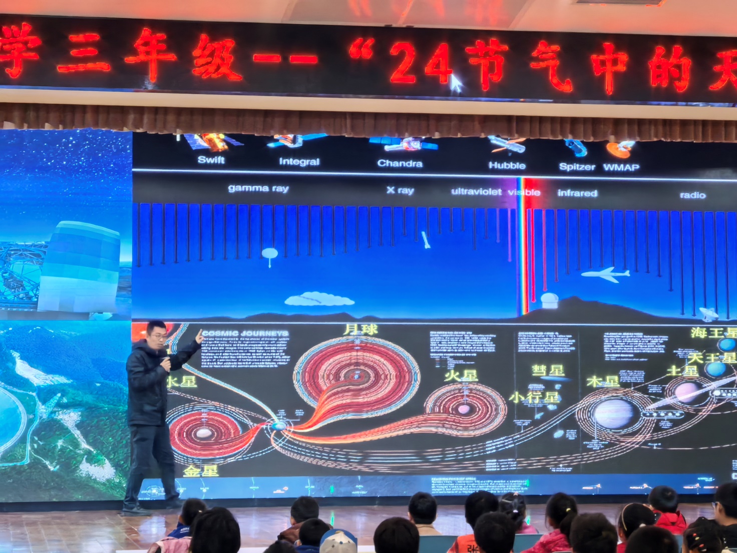 三年级2026年二十四节气台历制作活动就要开始了,10月21日上午,三年级全体师生在A楼五层报告厅上了一节别开生面的天文课。我们邀请了北师大天文系的高鹤副院长来为我们讲解。他首先为同学们讲了天文学是研究什么的:天文学的研究对象包括星星、月亮、太阳和太阳系、星系和宇宙。研究天文学的工具有光学望远镜、天眼、火箭和人造卫星等。