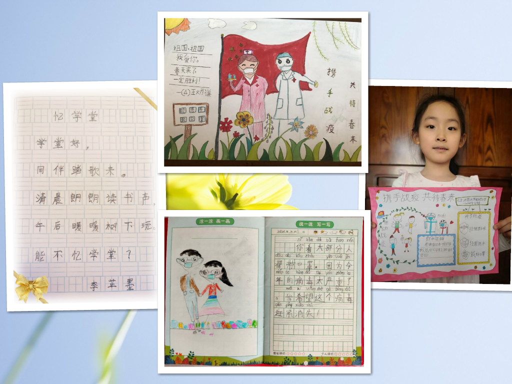 疫情期间,同学们积极响应国家防疫号召、闭门不出或少出,在家中度过了一个特殊的春天。虽然不能正常上课,也没有小朋友们的陪伴,但并没有停止学习的步伐,也没有改变快乐的天性。他们合理安排自己的时间,制订了计划,在爸妈的督促下按时完成任务;他们坚持学习,从书本上、视频里努力汲取知识;他们每天锻炼,通过平板支撑、仰卧起坐等室内活动增强体质;他们兴致勃勃,拖地洗衣,烘焙炒菜,客厅、卧室、厨房都是他们放飞自我的乐园。“阳春布德泽,万物生光辉”,同学们没有浪费光阴,而是充分利用这个假期,在德智体美劳上均有提升。