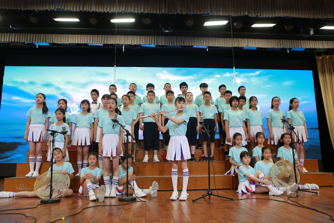 31号一早,终于轮到四(6)班上场了,在主持人说完介绍词后,同学们屏气凝神,各自摆好了优美、流畅的造型。接着,伴随着武朵儿同学那令人陶醉的笛声,程若水同学的朗诵娓娓荡开在舞台上,让全场进入了空灵幽深的意境。随着笛声渐渐停止,婉转的音乐响起,在精美的MV背景下,童声合唱《渔家姑娘在海边》悠悠响起,好似水流,恍若天籁。