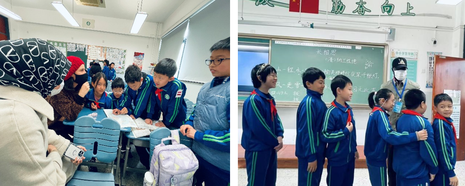 活动开始前,五年级5班的同学们早已整装以待。当10位分别来自欧洲、亚洲、非洲、美洲等地的国际中文教师步入教室时,同学们立刻报以雷鸣般的掌声,用最真挚的热情欢迎远道而来的客人。简短的问候过后,黄老师以诗词中的千年情怀为引导,迅速将师生带入沉浸式的学习情境中,也让远道而来的华语教师们感受到了中国课堂的独特张力。