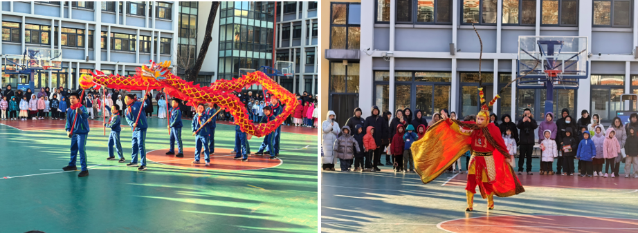 学校舞龙舞狮社团的哥哥姐姐们化身“非遗传承人”,敲起锣鼓、舞动龙狮,鲜艳的龙身、威风的狮头在操场上穿梭腾跃,瞬间点燃全场热情。就在大家看得目不转睛时,头戴紫金冠、身披黄金甲的“齐天大圣孙悟空”闪亮登场,一个筋斗翻到孩子们面前,引得萌娃们欢呼雀跃,争相上前与“大圣”热情互动。