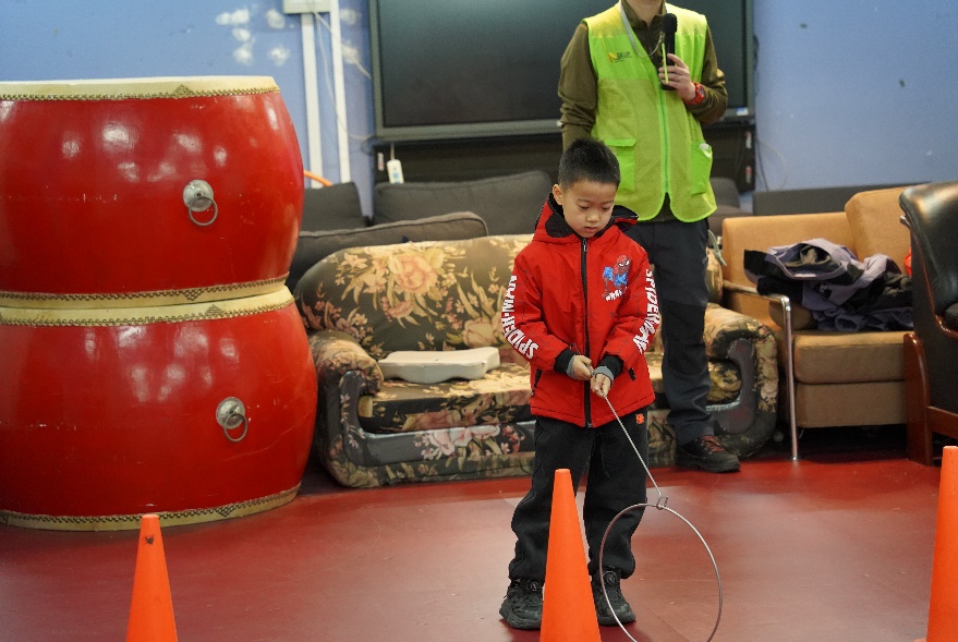 非遗闯关活动将气氛推向高潮。写福字的教室里,孩子们握着毛笔一笔一划认真书写,稚嫩的福字满载新年祝福;画脸谱区,大家拿起彩笔大胆创作,一张张色彩斑斓的脸谱活灵活现。投壶区,小选手们屏气凝神、瞄准投掷,欢呼声与惋惜声此起彼伏;抖空竹、套圈、拉铁环等经典游戏也吸引了大批“小玩家”,大家穿梭在各个摊位之间,尽情体验传统非遗项目的独特魅力,校园里处处洋溢着欢声笑语。