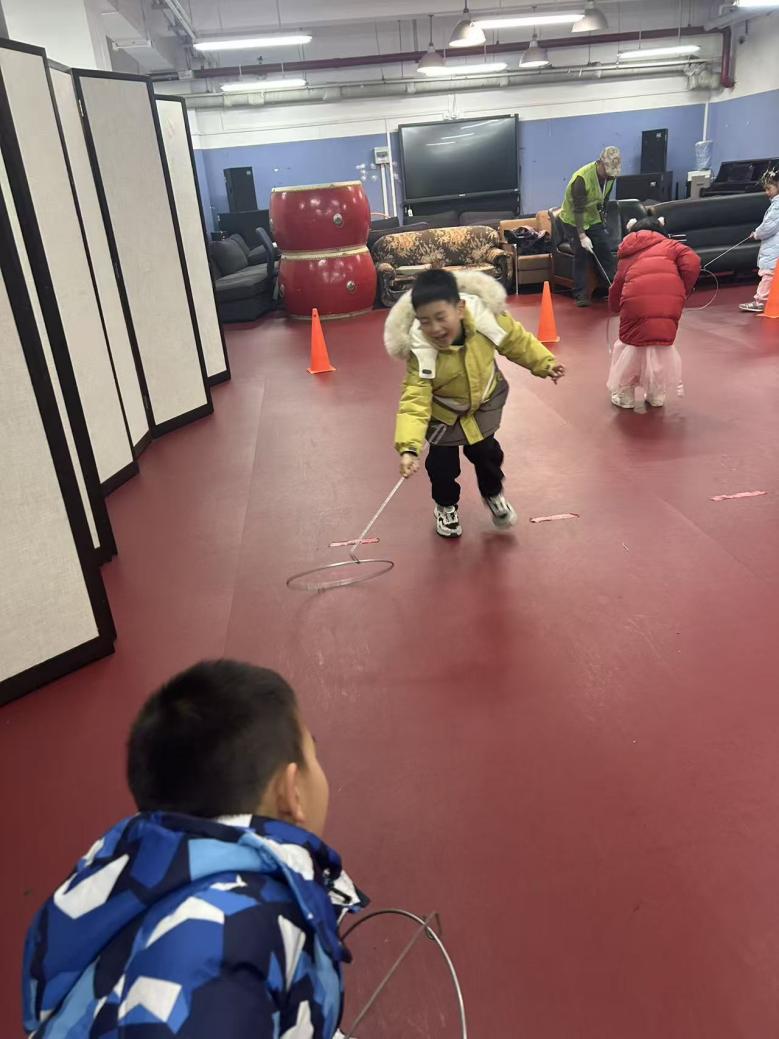 最热闹的当数“快乐跳绳”环节。在单摇项目中,同学们动作连贯、节奏稳定,展现了日常体育课中的认真练习。在“一带一”合作跳绳中,几组搭档默契配合。同学们都在一旁计数、加油、鼓掌,笑声与掌声交织在一起,教室里洋溢着纯粹而热烈的快乐。