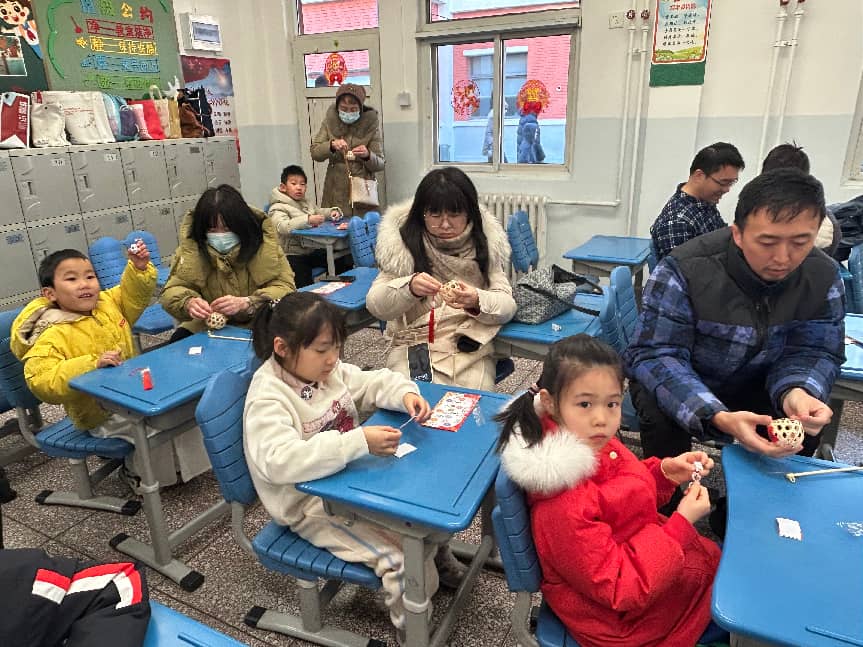 在教室里的传统文化活动“做灯笼”中,孩子们在老师和家长的指导下,亲手制作灯笼。穿一穿、贴一贴、挂一挂,一盏盏灯笼逐渐成形。在其他班级教室里,孩子们也体验了写福字、做脸谱、套圈、抖空竹、滚铁环、投壶等丰富多彩的活动,沉浸在“年味”十足的互动环节中。一件件红红火火的作品在亲手创造中完成,一句句“爸爸你真厉害”“妈妈我们一起画吧”在场地接连响起。这样的时光短暂却温暖,成为孩子成长旅途中最温柔的回忆。
