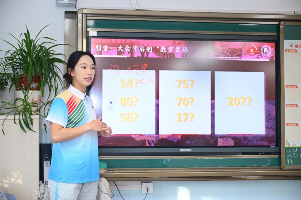 首先,志愿者大姐姐带我们回顾了纪念中国人民抗日战争暨世界反法西斯战争胜利80周年大会的整个过程,给我们介绍了大会背后的“数字密码”——14、80、56等数字。其中,数字“14”代表中华民族14年可歌可泣的抗战历程,这个元素在大会中也多次体现,如:7架歼-10表演机拉出14道彩烟、巍然矗立的年号台高达14米、年号台镌嵌14座长城烽燧、14只和平鸽雕塑等等。数字“80”代表纪念中国人民抗日战争暨世界反法西斯战争胜利80周年,大会中天安门广场周围迎风招展的80面五星红旗、26架直升机编队汇成的巨大“80”字样都用到了80的元素。数字“56”代表五十六个民族向着强国建设、民族复兴的宏伟目标奋勇前进。