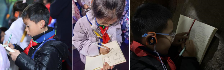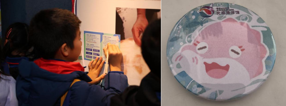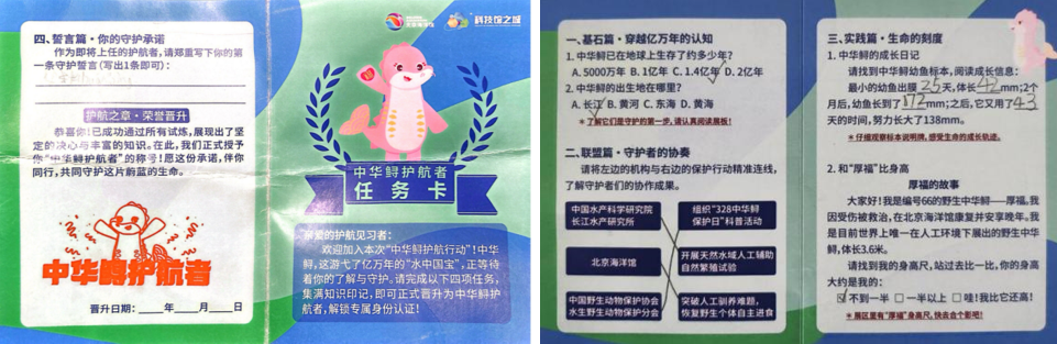 这是孩子们印象最为深刻的一个环节。生于长江、长于东海的中华鲟以惊人的体重、悠久的历史和洄游的艰辛深深打动着孩子们的心灵。而最为令人动容的,是这样勇猛有力的鱼儿,如今竟然面临着灭绝的危机。这大大激发了同学们保护濒危动物的决心。听完讲解后,他们学以致用,填写了任务卡,兑换了一枚枚“中华鲟护航者”的勋章。