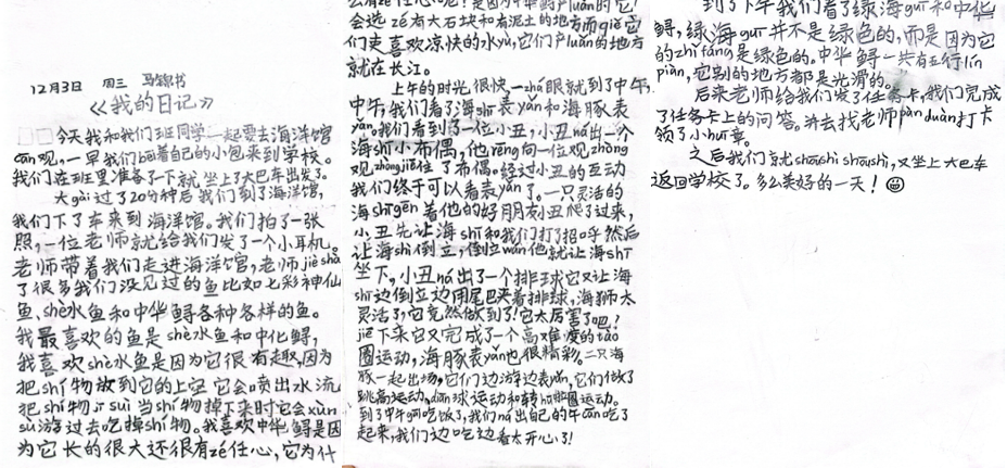 白珈祺:我们一起去了海洋馆,那里有各种各样的海洋生物,我很喜欢它们。所以我决定保护它们,我会做到不往海洋里扔垃圾,这样海洋生物的数量就不会变得更少。