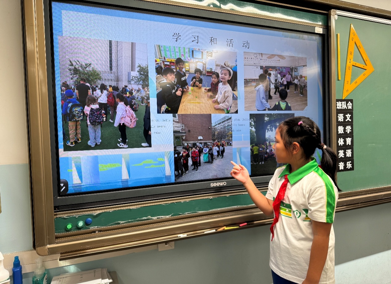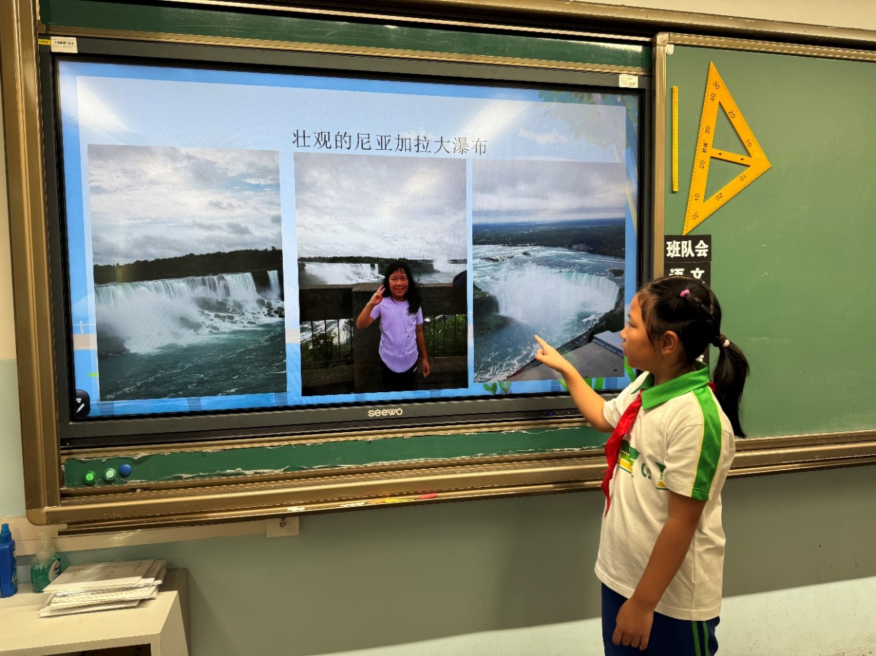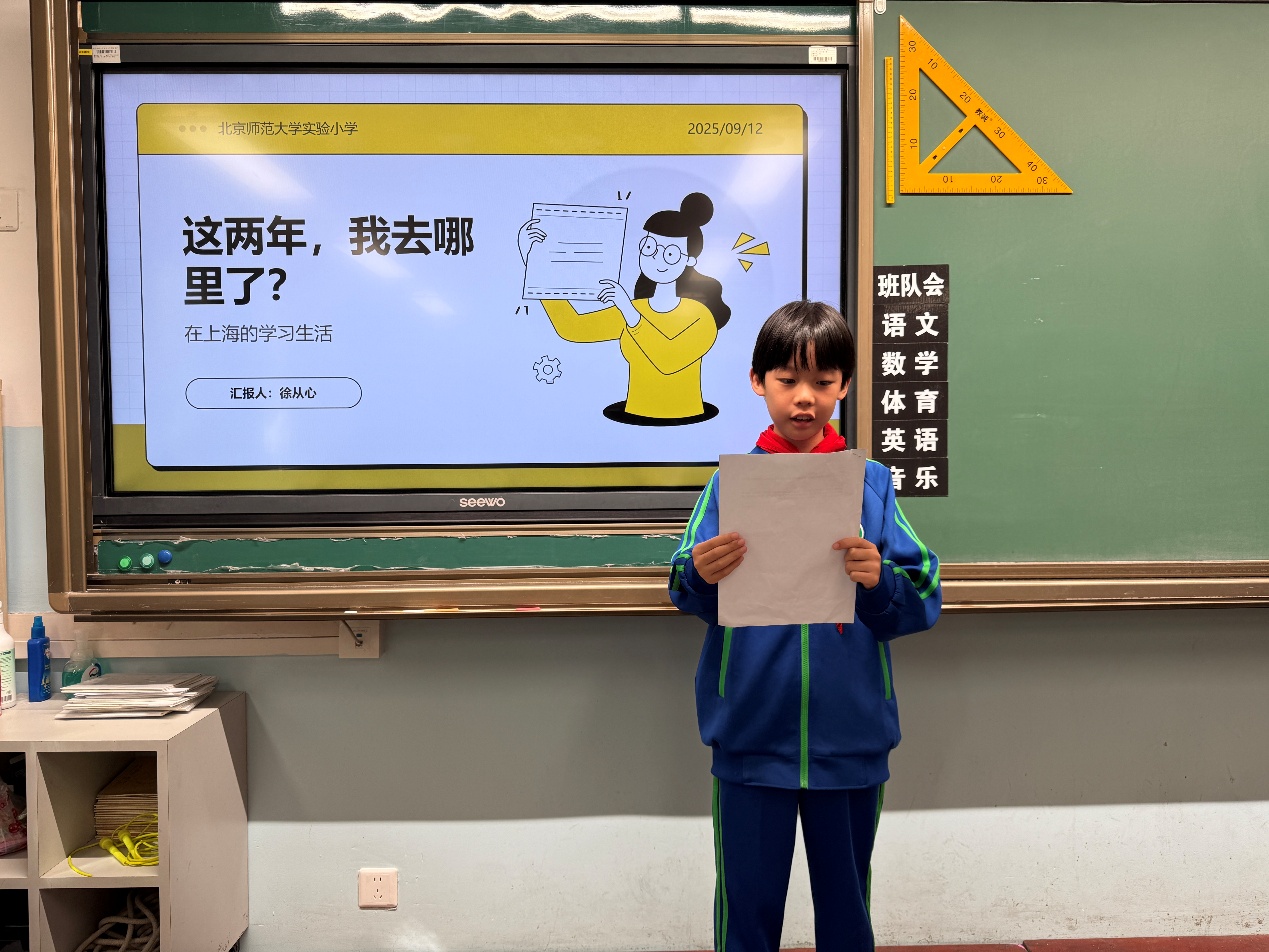 2025年9月开学伊始,北京师范大学实验小学四年级6班的教室里掌声阵阵,一场特殊的 “游学成长分享” 主题班会在此举行。从上海游学两年的徐从心同学与从加拿大游学一年的李念瑶同学,带着满满的收获与见闻,为全班同学带来了精彩的经历分享,作为班级通讯员,我全程记录下这温暖又励志的时刻。