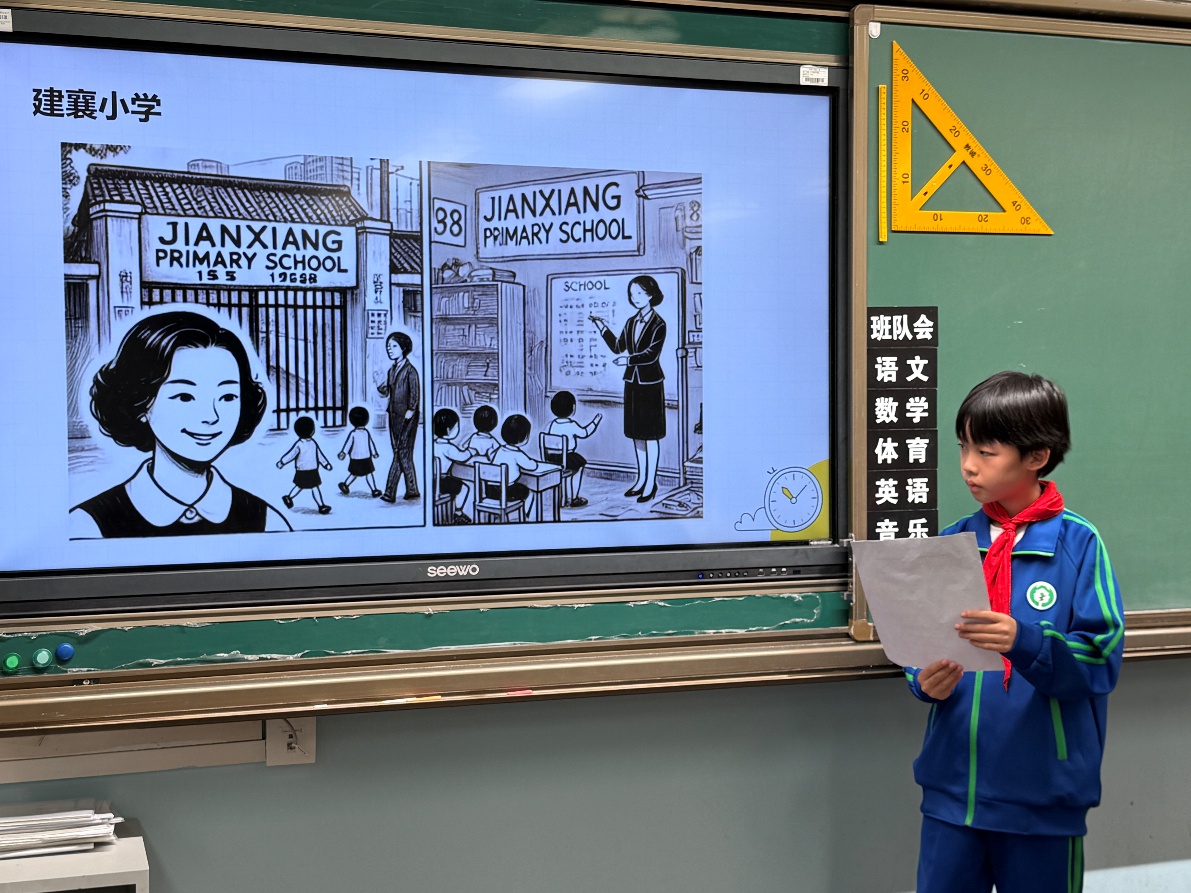 班会上,徐从心同学用PPT带来了上海游学的故事。他以“这两年,我去哪里了?”为开篇,围绕上海建襄小学的生活展开分享。从 “车库里成立的小学”的校史故事,到“鸡毛也要飞上天”的奋斗精神,他用生动的讲述展现了建襄小学的独特校园文化;“威风的职位”“脏水变清水”的实践项目与“会购物的机器人”等创新活动,让同学们看到上海校园里丰富的实践与科技元素。此外,他还分享了猜谜语的趣味互动与游江南的美好经历,带大家领略了上海的城市活力与江南的人文风光。