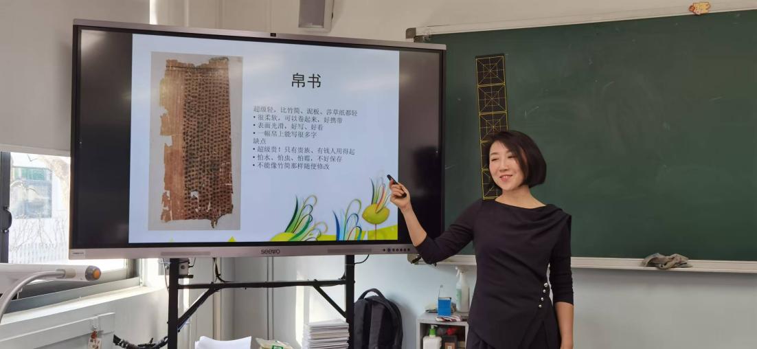 这时有小朋友提出“中国古人用什么写字?”当话题转向东方,孩子们的热情更加高涨。李老师首先介绍了竹简。将竹子劈成细条、晒干烤干,用绳子编连起来就成了竹简。它比泥板轻便,比莎草纸结实,便宜易得,让普通人也能接触书写。它的缺点是太重太占地方,一片写不了几个字。除了竹简以外,中国古代还有一种轻便柔软、表面光滑的书写材料,也就是丝绸。但作为书写材料,丝绸太贵了,只有贵族用得起。两种材料各有利弊,直到公元105年,东汉蔡伦改进了造纸工艺,使用麻头、破布、旧渔网和树皮造纸,为纸张的大规模生产打开了大门。这种纸张便宜好用,为知识的普及打开了大门。