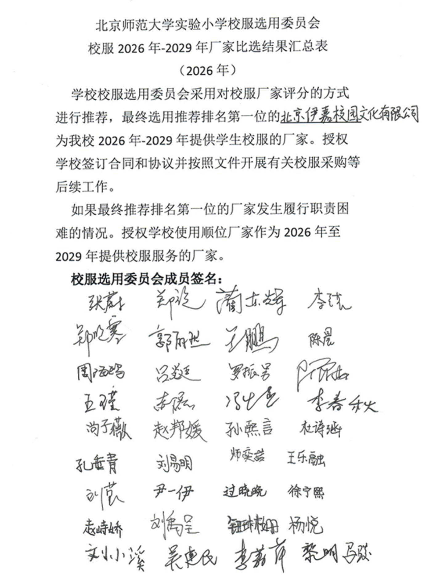学校校服选用委员会面向社会公开征集符合资质要求的校服生产企业。选出最优的三家进行筛选。最终选用推荐排名第一位的北京伊嘉校园文化有限公司为我校2026年-2029年提供学生校服的厂家。授权学校签订合同和协议,并按照文件开展有关校服采购后续工作。相关工作形成会议纪要并存档。