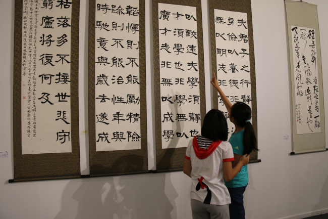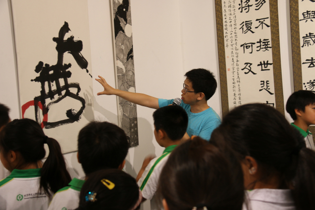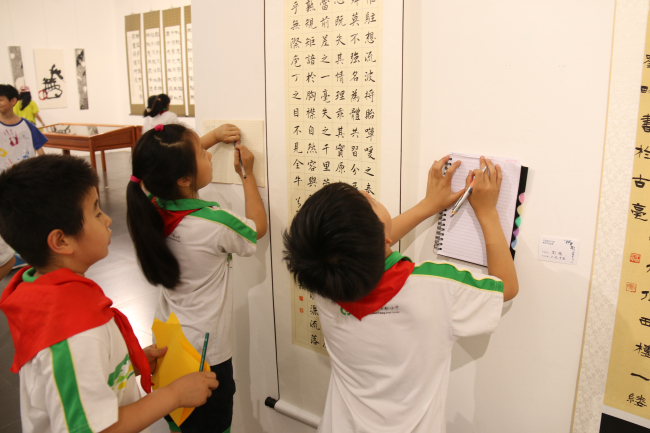 在参观书法展的过程中,罗老师和陶老师挑选出一些具有代表性的书法作品耐心向同学们讲解,讲解所涉及的领域包括书法的字体、章法形式、书写材料、装裱工艺等方面,以引导孩子们欣赏展厅里各种样式的书法作品。同学们在展厅里专心聆听老师讲述,认真作好参观记录,维持了展厅里良好的参观秩序,让参观活动得以顺利完成。