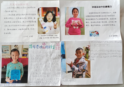 三年级的同学们在以冬奥为主题的科学课上,了解到了2022北京冬奥会的奖牌设计中蕴含的中国古代天文、中国古代的玉文化以及蚕文化知识,欣赏了美轮美奂的冬奥场馆照片,学习了冬奥场馆设计和改造中的中国元素和科技创新。在此基础上,同学们结合三年级科学所学习的水的三态知识,受老师拓展的冰雪知识的激发,自己设计并制作出了一个个丰富多彩、姿态各异的有趣的冰,有的同学甚至在爸爸妈妈的带领下还亲自体验了一把滑雪的快乐。在玩冰雪的同时,同学们还各自选择了一项自己喜欢的冬奥运动项目向大家做了科普。通过这次冬奥科学实践活动,进一步提高了同学们的学以致用,以用促学的意识,培养了创造能力。让我们作好学习—实践——创新的准备,一起迎接美好的未来!