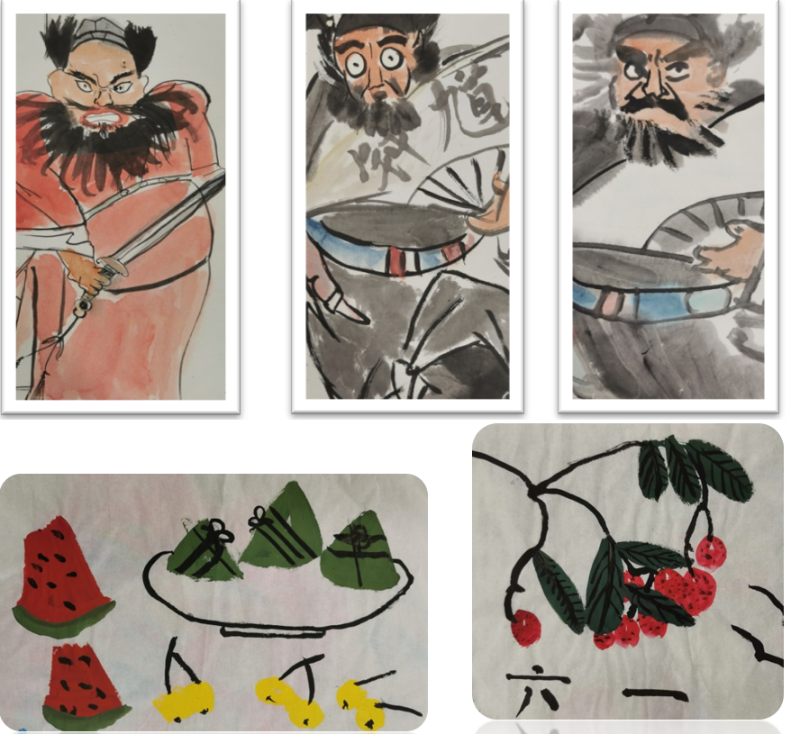 六年级开展端午文化传承,主要是结合本学期学习中国水墨绘画的课程,向学生传承了端午文化中的钟馗文化与端午清供文化,学生以神话传说中的钟馗形象创作出了水墨画。在疫情居家期间,通过网络平台对学生又进一步的宣传了端午文化的各种知识内容。