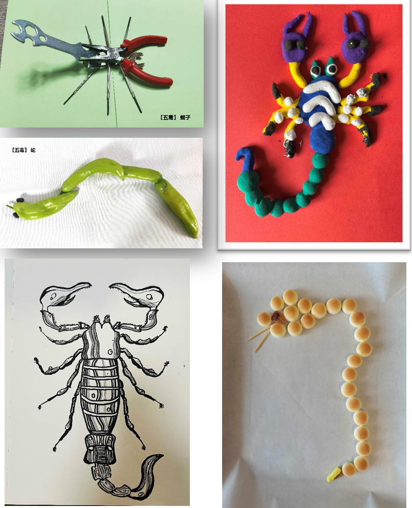 疫情居家学习期间,我们又通过平台教学开展了端午文化的传承学习讲座,并启发学生以“端午五毒为形象”利用周围的各种物品来制作、摆放,拍照等形式来呈现作品。