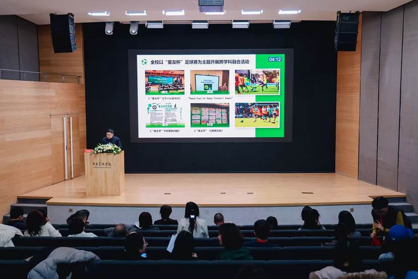 接着,邓宝剑教授介绍了“班级足球赛艺术展演”项目式学习的实施过程:分别讲述了“如何完成足球赛艺术展演活动方案”,“如何呈现并确定班级足球赛艺术展演方案”,“艺术学科如何完成足球赛艺术展演的准备工作”等分解驱动问题;重点说明了音乐组(《绿茵疾风》合唱)、舞蹈组(啦啦操表演)、美术组(队徽设计与制作)、书法组(书写并制作足球赛横幅)的教学活动和设计思路,图文并茂地向与会专家展示了我校学生在本项目式学习中所展现出来的艺术才华与风采。