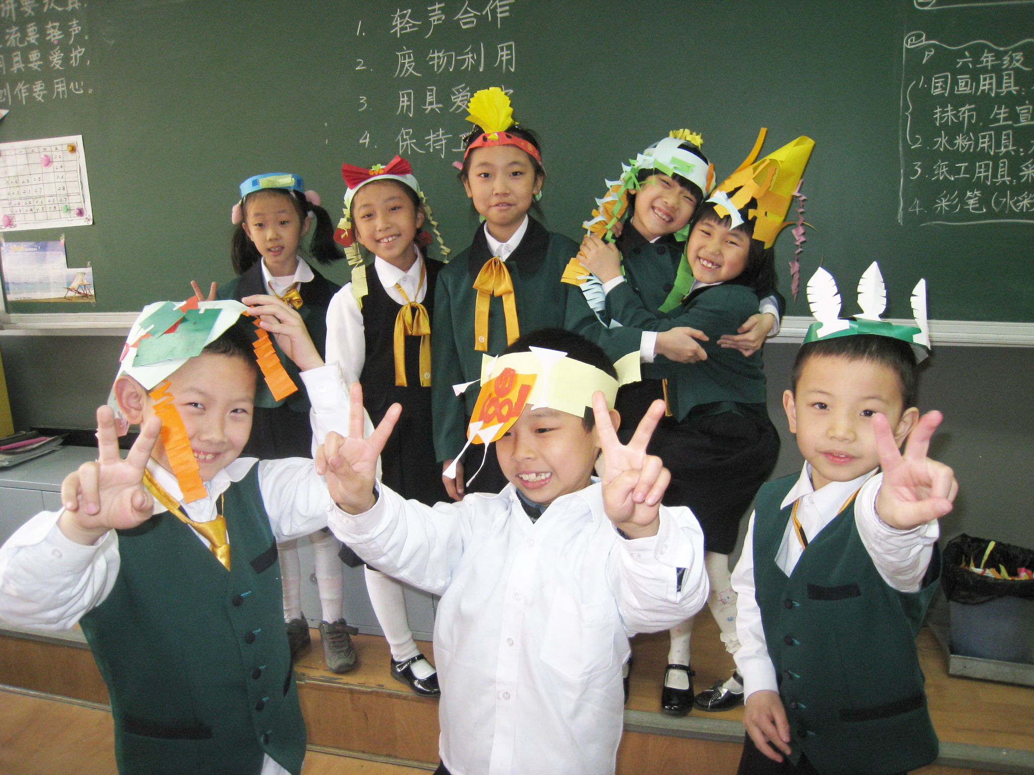 这是二年级同学在本学年《头饰设计》这节课上的设计作品,看他们一个个神气的模样,多开心。