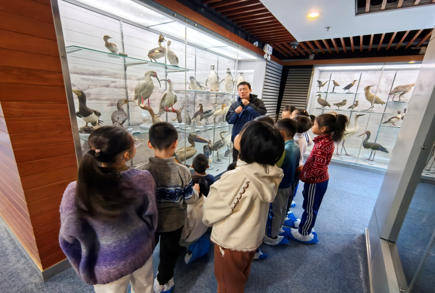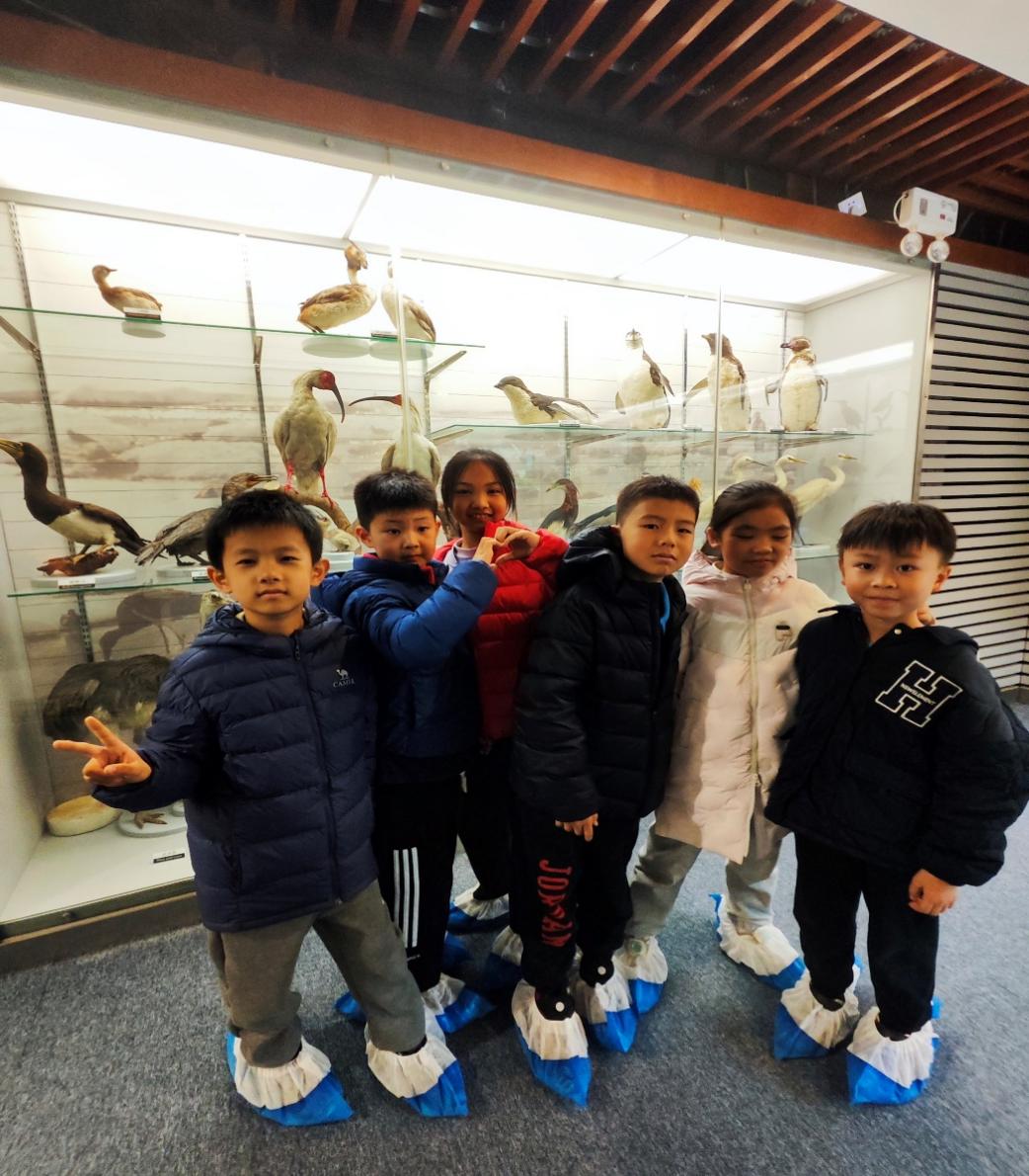 一进馆,大家就被眼前的一幅幅景象深深地吸引了!威风凛凛的棕熊标本伫立在展厅中,圆滚滚的身子、厚厚的皮毛,好像下一秒就要站起来走路似的。那些彩色的蝴蝶标本挂了满满一面墙,像无数只小彩虹停在那儿。还有摇着尾巴的企鹅、雪白雪白的朱鹮,都是我们在课本里见过、却从没近距离看到过的小家伙。馆长老师耐心讲解着每一件标本的故事,从动物的身体结构到植物的生长奥秘,我们都听得入了迷。大家踮着脚尖观察植物标本的纹路,小声讨论着动物的生活习性,好奇心被深深点燃。