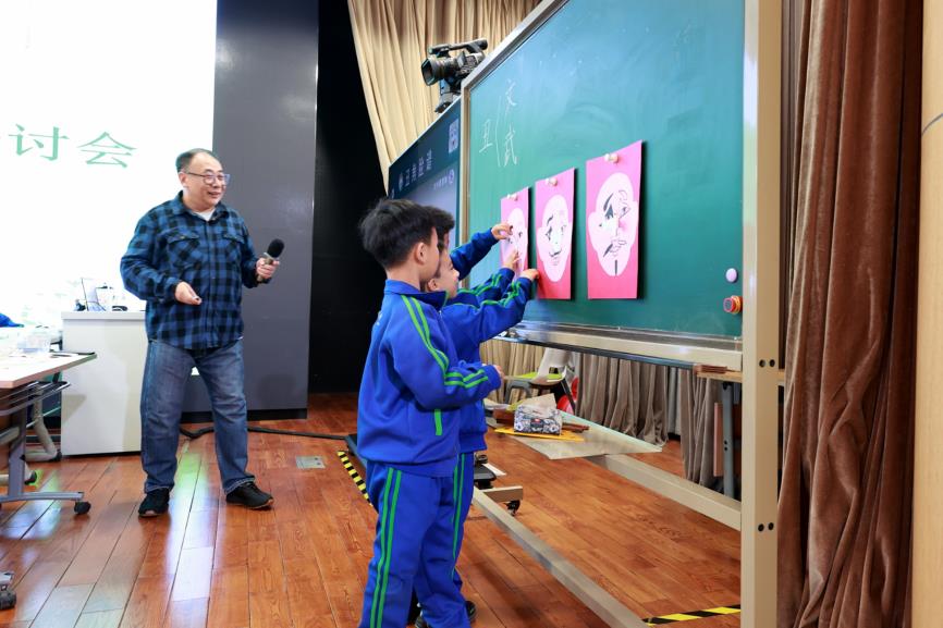 接下来,蒯卫华教授对两堂研讨课进行专业点评。她充分肯定了这两节“戏曲进校园”的活力课堂研讨课,选题聚焦国粹“丑角”,美术课无实物表演、提炼脸谱元素,音乐课数板《报灯名》练节奏、眼神、字正腔圆,两课无缝衔接,全员沉浸式体验。教学体现了新课标“大单元、跨学科、项目式”等新理念,梯度适宜,传统文化种子悄然播撒,为低年级艺术综合课程提供可推广范式。最后,李荔萍书记代表学校致谢,表示将持续搭平台、给资源,让艺术课堂持续润泽童心,丰盈生命。