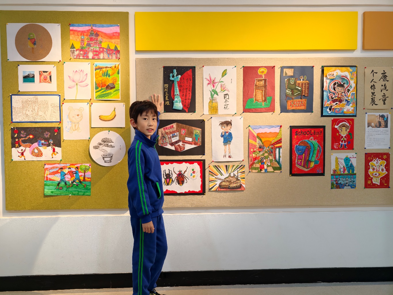 近日,北京师范大学实验小学四年级3班康洛潼同学的个人美术作品展在学校C楼二层艺术展厅正式展出。作品表现形式丰富:马克笔画、彩色铅笔画、油画棒画、碳素笔画等;有平面作品和半立体作品;内容有漂亮的动漫哪吒人物、青铜大立人、帅气的柯南、可爱的小动物、美丽的风景、欧式风格的家具、美味的食品等等。画面生动有趣,题材广泛,令人赏心悦目。欢迎同学们来观摩!