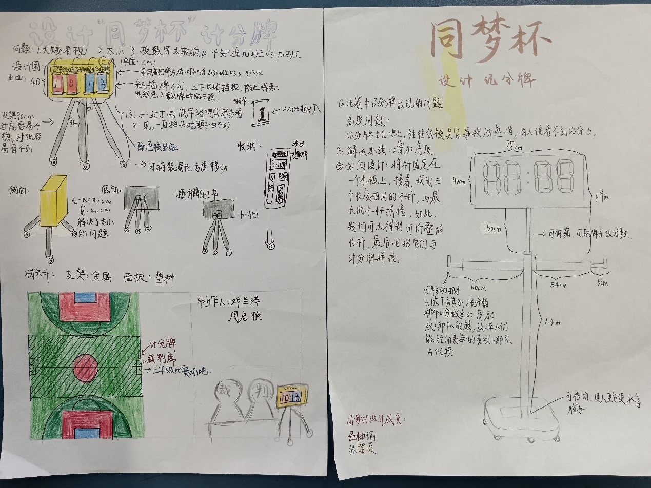 本学期,学校“同梦杯”篮球赛进行的如火如荼,六年级同学在比赛过程中发现,记分牌有时候会被过于热情的小观众遮挡,于是他们结合“小小工程师”单元的学习内容,对记分牌进行改进设计,并搭建模型。