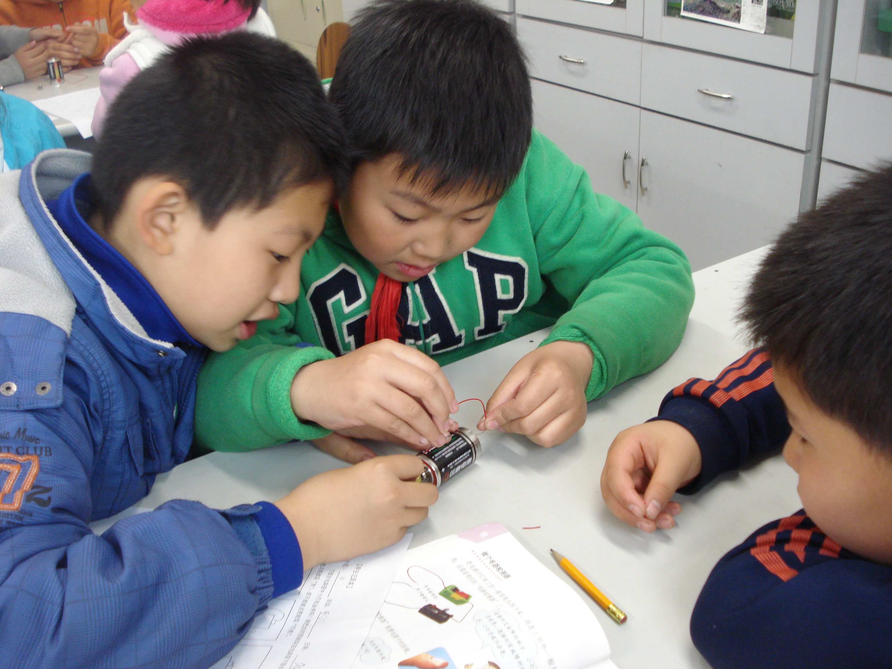 四年级同学三至八班的4月份的科学课上,学习了“新的生命”单元和“电”单元的部分内容。在“新的生命”单元里,我们研究了花的结构和类型以及动物的卵及繁殖,开展了“小鸡孵化”实践活动,虽然因为禽流感的原因,活动中途停止,但是已经引起了同学们对生命的惊奇和关注。在“电”单元里,我们探索了灯泡的秘密,尝试着点亮了小灯泡,同学们为自己成为一个个成功点亮小灯泡的“小科学家”而兴奋不已。