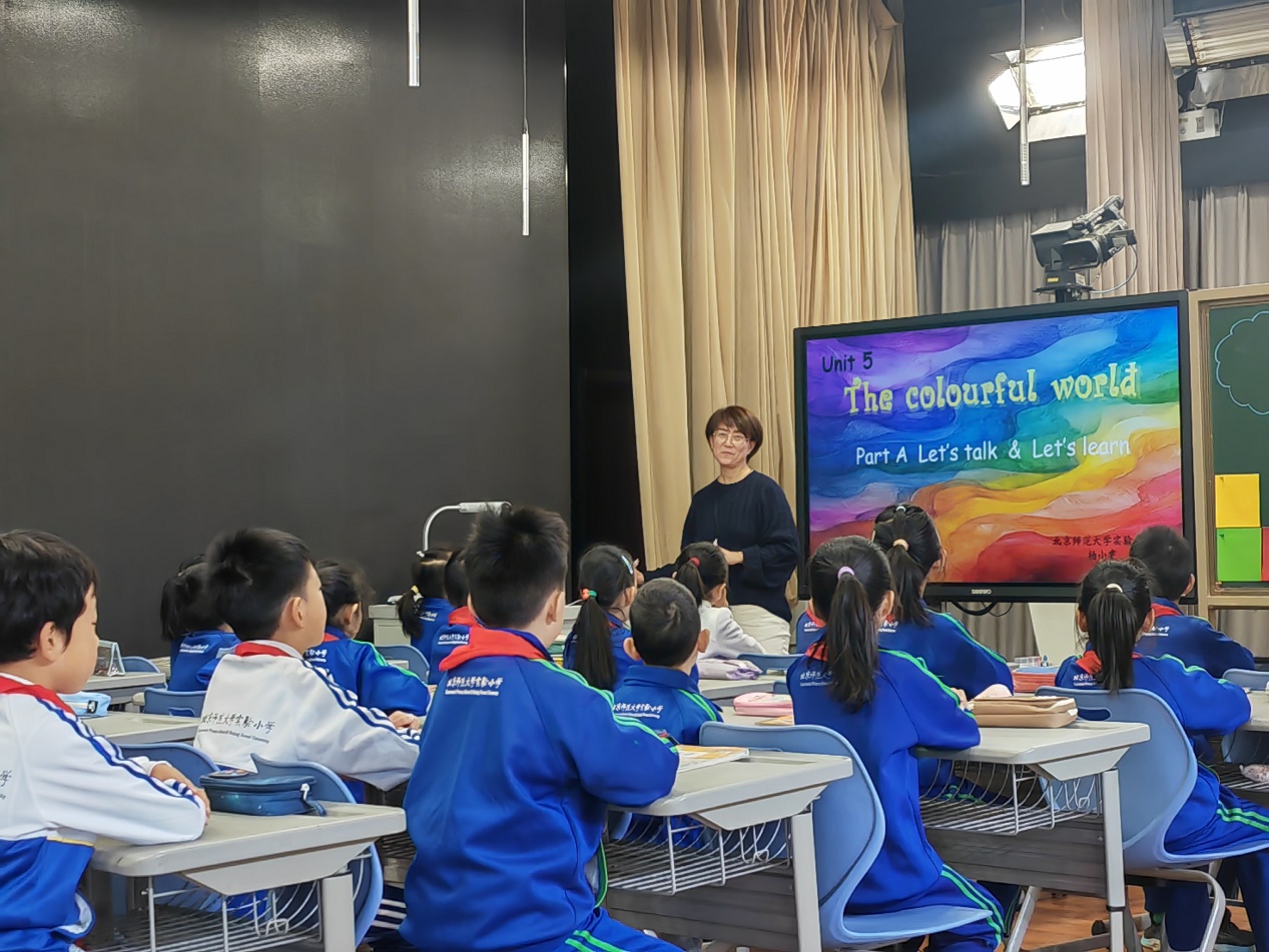 杨小霞老师则通过Unit 5 The colourful world 的教学带领三年级学生,进行了一场色彩探索之旅。课堂以“颜色混合”实验为核心,学生通过亲手操作色卡、观看五彩海底世界,在发现与体验中学习语言。本节课巧妙地将英语学习与美术学科融合,让学生在理解“...and...make...”句型的同时,培养了观察力与逻辑思维,是“以学生为中心”教学理念的生动实践。