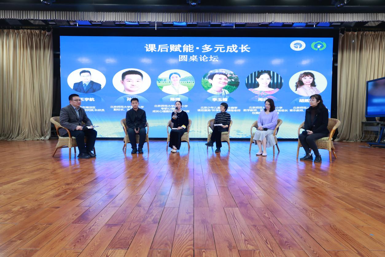 海淀区教育科学院科研员王宇航主持了后续的圆桌论坛,访谈了我校副校长、体育教师孙彬,课后服务负责人兼音乐教师胡燕丽,数学老师、班主任年级组长、舞蹈社团负责人周欣,专职心理教师兼成长心理剧社团负责教师陈梅,我校校友、北京少年儿童出版社编审、课后服务“科学阅读”课程李玉帼老师,围绕课程体系设计、心理健康、师资多元整合、校外资源准入与评估、课内外育人协同、质量监测反馈等关键议题,展开了深入而生动的对话。