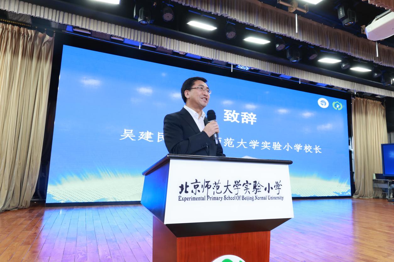 北师大实验小学校长吴建民致欢迎辞。吴校长介绍,作为北师大的附属学校,北师大实验小学深耕课后服务20余年,始终以学生需求为核心,打造了课后服务“1+3+N” 模式;表示此次会议为全市范围内搭建了交流平台,期待和与会者共探课后服务提质路径,助力首都基础教育发展。