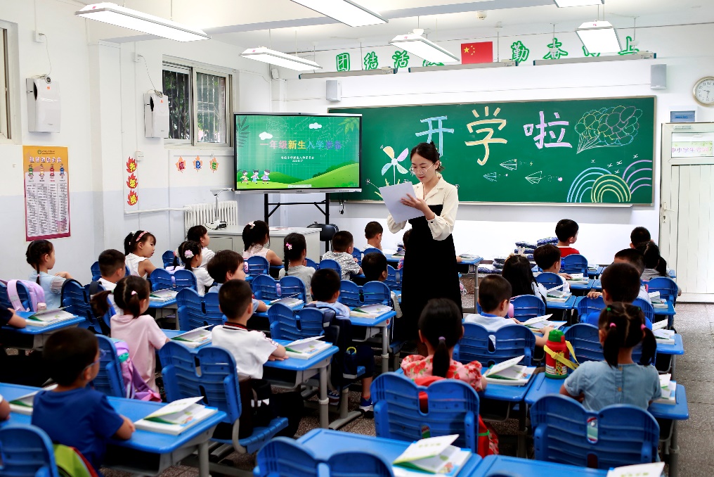同学们来到教室中根据引导找到自己座位、领取学习用品、听老师说明开学准备等,一个个小身板坐得可直了。