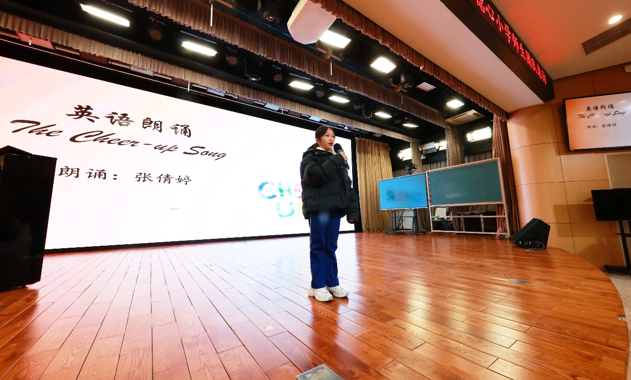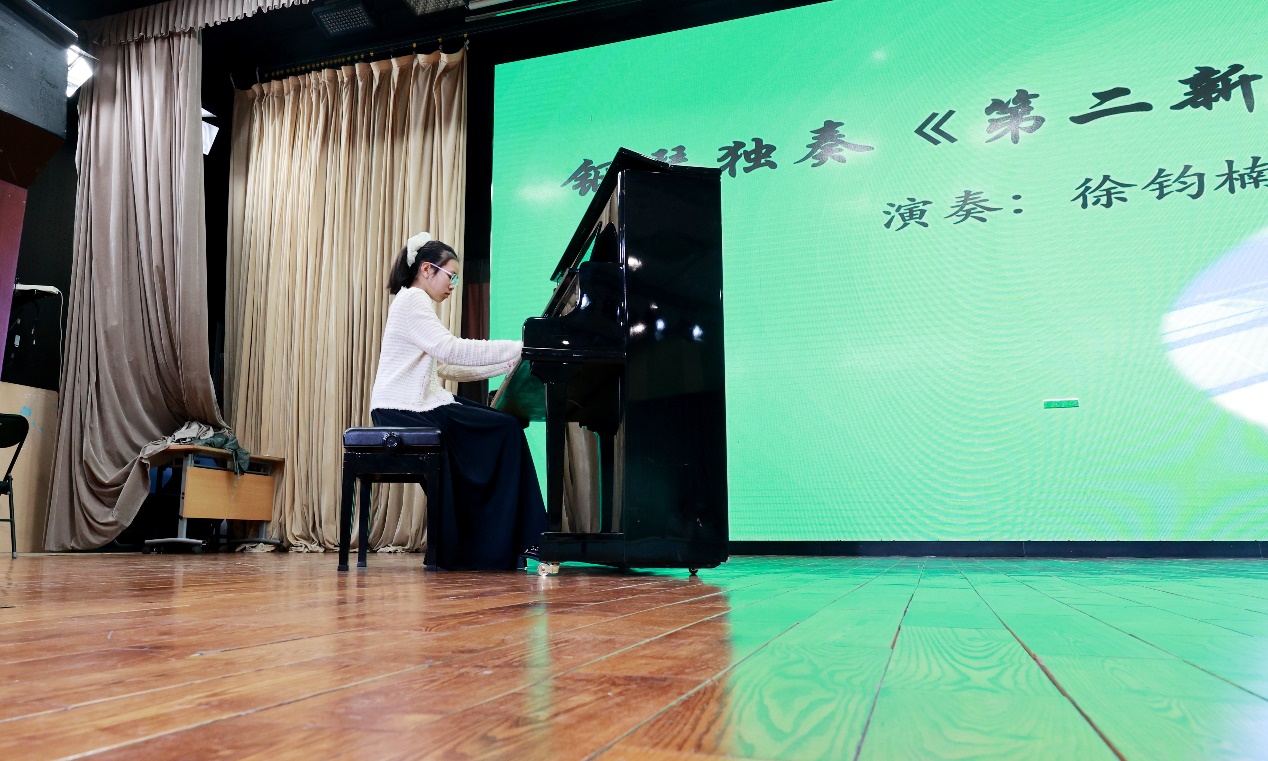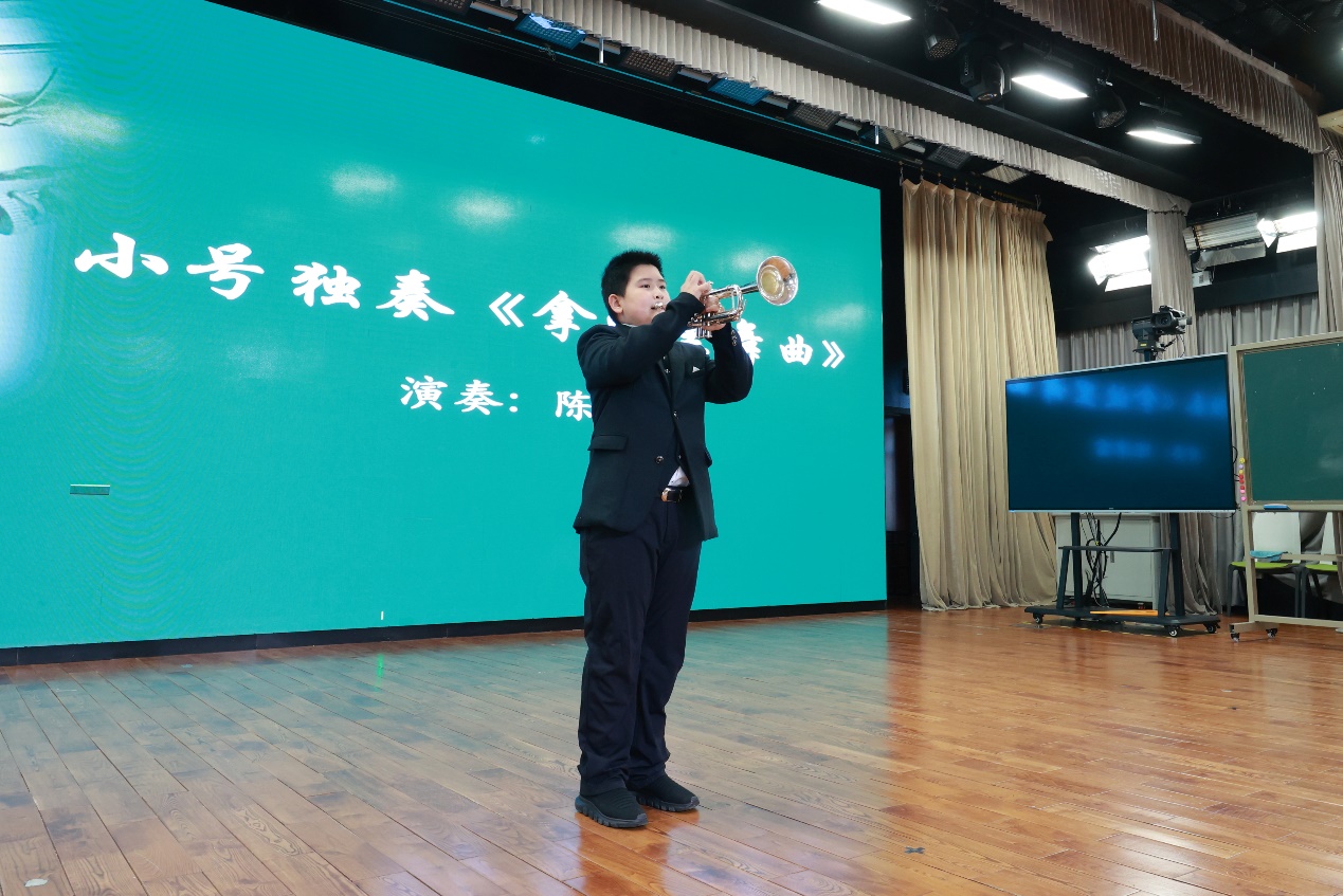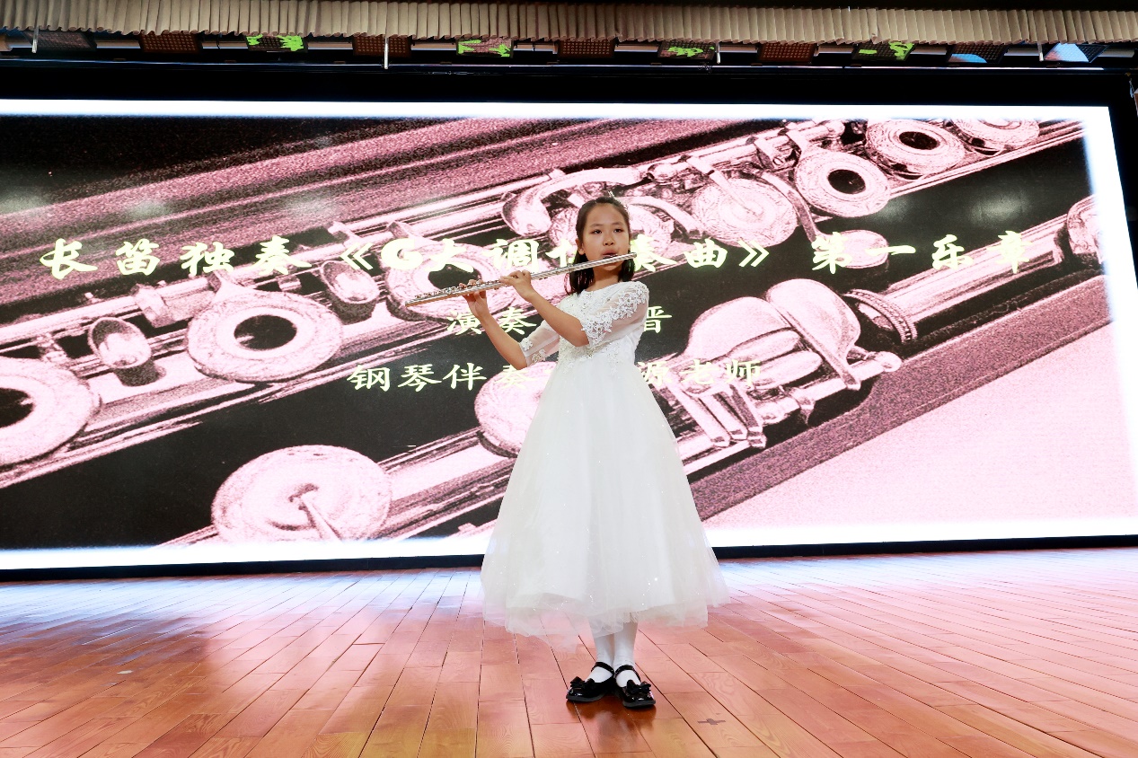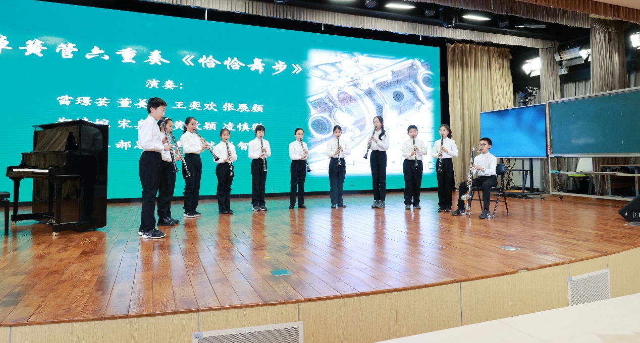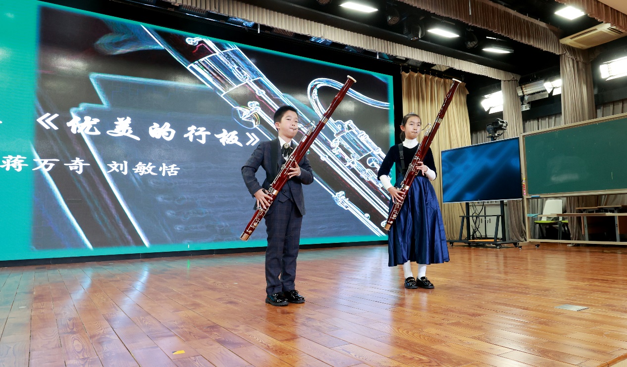 在文艺展演环节,两校学子各展所长,用音乐与朗诵搭建起心灵的桥梁。我校管乐团陈津雷同学的小号独奏《拿波里舞曲》激昂欢快,秦晋同学的长笛独奏典雅悠扬,蒋万奇、刘敏恬同学的巴松二重奏严谨优美,叶蓁蓁同学的大提琴独奏《黄水谣》配合李诗婵同学的钢琴伴奏深情款款,徐钧楠同学的钢琴曲《第二新疆舞曲》则充满民族风情,单簧管声部同学带来的《恰恰舞步》轻快活泼……五年级同学代表展示的表演唱《少年中国说》更是唱出了新时代少年的昂扬志气。
