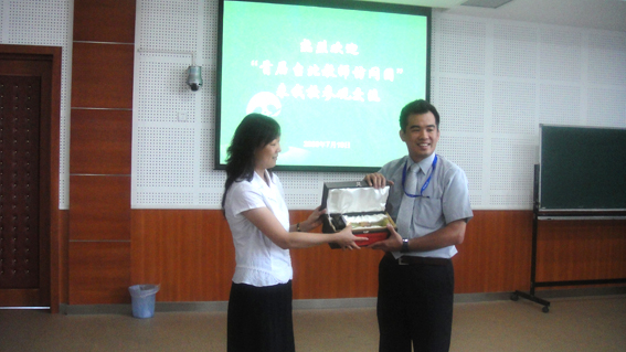 2009年7月18日 上午,正值放假期间,我校马骏副校长、郭新主任、王崇娥主任、叶晓宏主任以及黎明和杜海老师,接待了来自台湾的“首届台北教师访问团”。由台北市教师会理事洪宗男先生和陈文杰先生带队,包括台北国立林口启智学校黄开成校长、桃园县复兴乡小学校长严朝宝先生等一行30人的访问团,在学校领导和干部的陪同下,首先参观了学校的校园、图书馆以及学校教学C楼的音乐和美术专用教室。随后在多功能厅,马骏副校长致简短的欢迎词,并向客人们简要介绍了学校的基本情况,包括学校办学理念和办学特色、学校课的程设置、学校基本作息安排以及开展的学科特色活动等,还特别向客人们介绍了教师开展校本教研的一些做法。台北的老师们对学校的方方面面都非常感兴趣,在互动交流中,马校长回答了关于学校品德课的教学实施,郭主任回答了学校工会的作用,黎明老师回答了学校基础建设的流程等学校实际工作的实施情况,现场气氛热烈而又和谐。